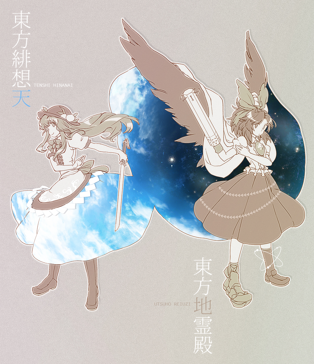 2girls arm_cannon bad_id bad_pixiv_id bow brown_theme cape earth_(planet) female_focus food fruit hair_bow hat hinanawi_tenshi long_hair monochrome multiple_girls peach reiuji_utsuho short_hair sky spot_color sword sword_of_hisou touhou weapon wings yukizen