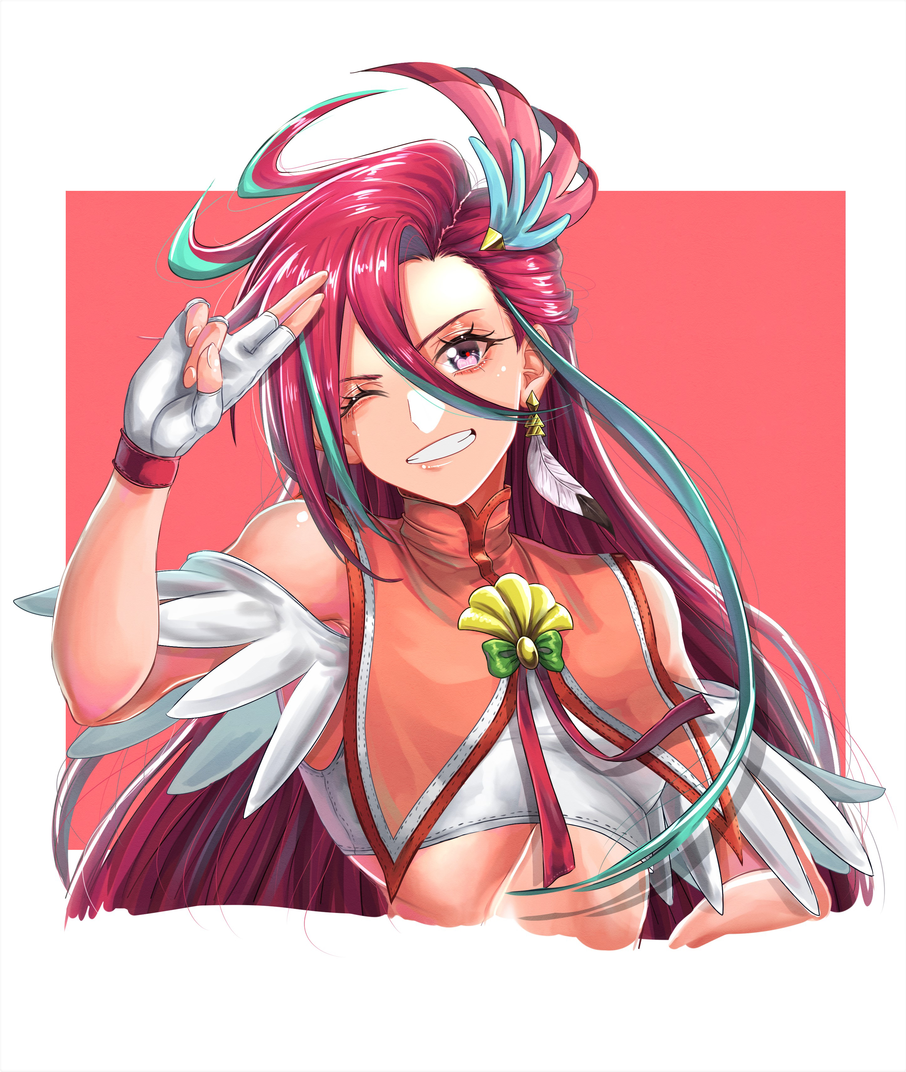1girl absurdres crop_top cure_flamingo earrings feather_earrings feathers hair_ornament highres jewelry long_hair looking_at_viewer magical_girl one_eye_closed precure purple_eyes red_background red_hair sakana_sakanama smile takizawa_asuka tropical-rouge!_precure two-tone_background upper_body white_background