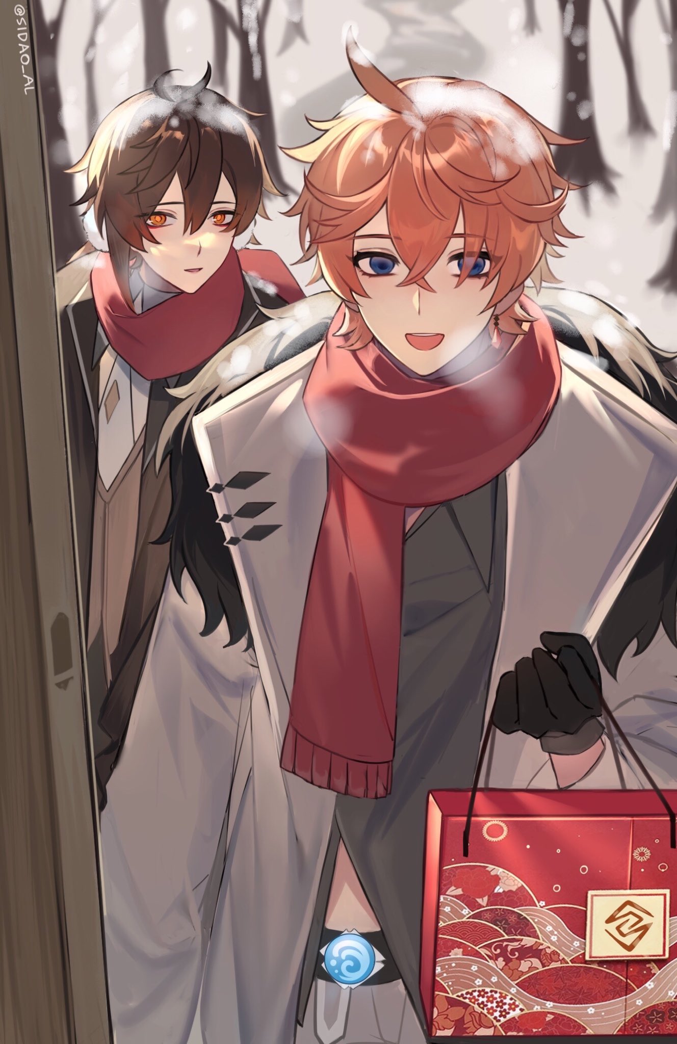 2boys :d ahoge artist_name bag belt black_belt black_gloves blue_eyes brown_eyes brown_hair brown_vest coat collared_shirt commentary_request crossed_bangs day doorway earmuffs fatui_coat fur-trimmed_coat fur_trim genshin_impact gift_bag gloves grey_coat grey_pants grey_shirt hair_between_eyes hand_up highres holding holding_bag lapels long_sleeves looking_at_viewer male_focus multiple_boys necktie open_clothes open_coat open_mouth orange_hair pants path pov_doorway red_scarf road scarf shirt short_hair sidao_al smile snow snow_on_head snowing standing tartaglia_(genshin_impact) tree vest vision_(genshin_impact) white_necktie winter zhongli_(genshin_impact)