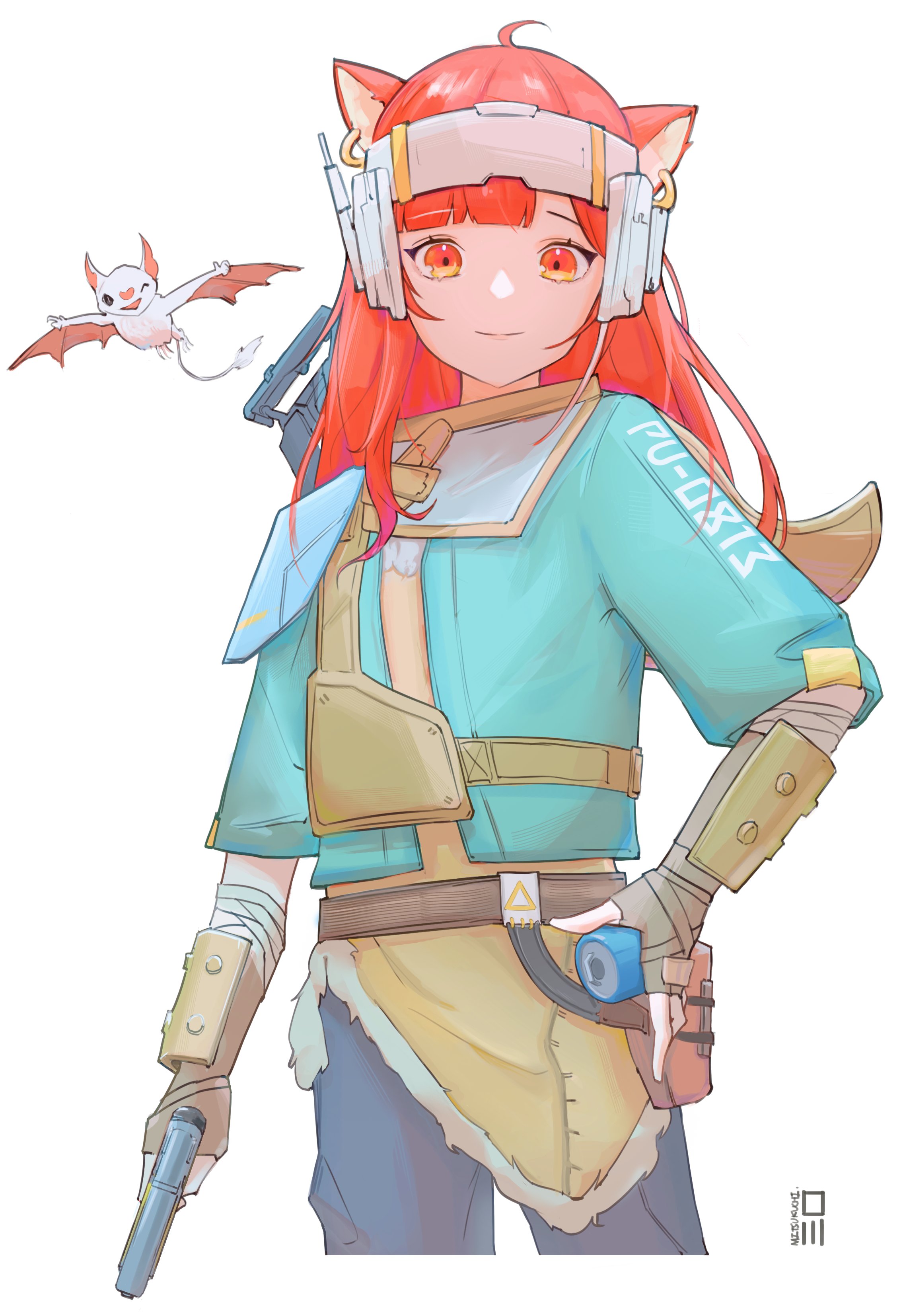 1girl absurdres apex_legends bat_(animal) blue_eyes blue_jacket blue_pants brown_eyes brown_gloves cosplay echo_(apex_legends) fingerless_gloves gloves gun hand_on_own_hip headband highres holding holding_gun holding_weapon jacket miguchi_(mitsukuchi_) nijisanji one_eye_closed p2020_(pistol) pants ratna_petit red_hair red_panda_ears red_panda_girl smile solo vantage_(apex_legends) vantage_(apex_legends)_(cosplay) virtual_youtuber weapon white_background white_headband