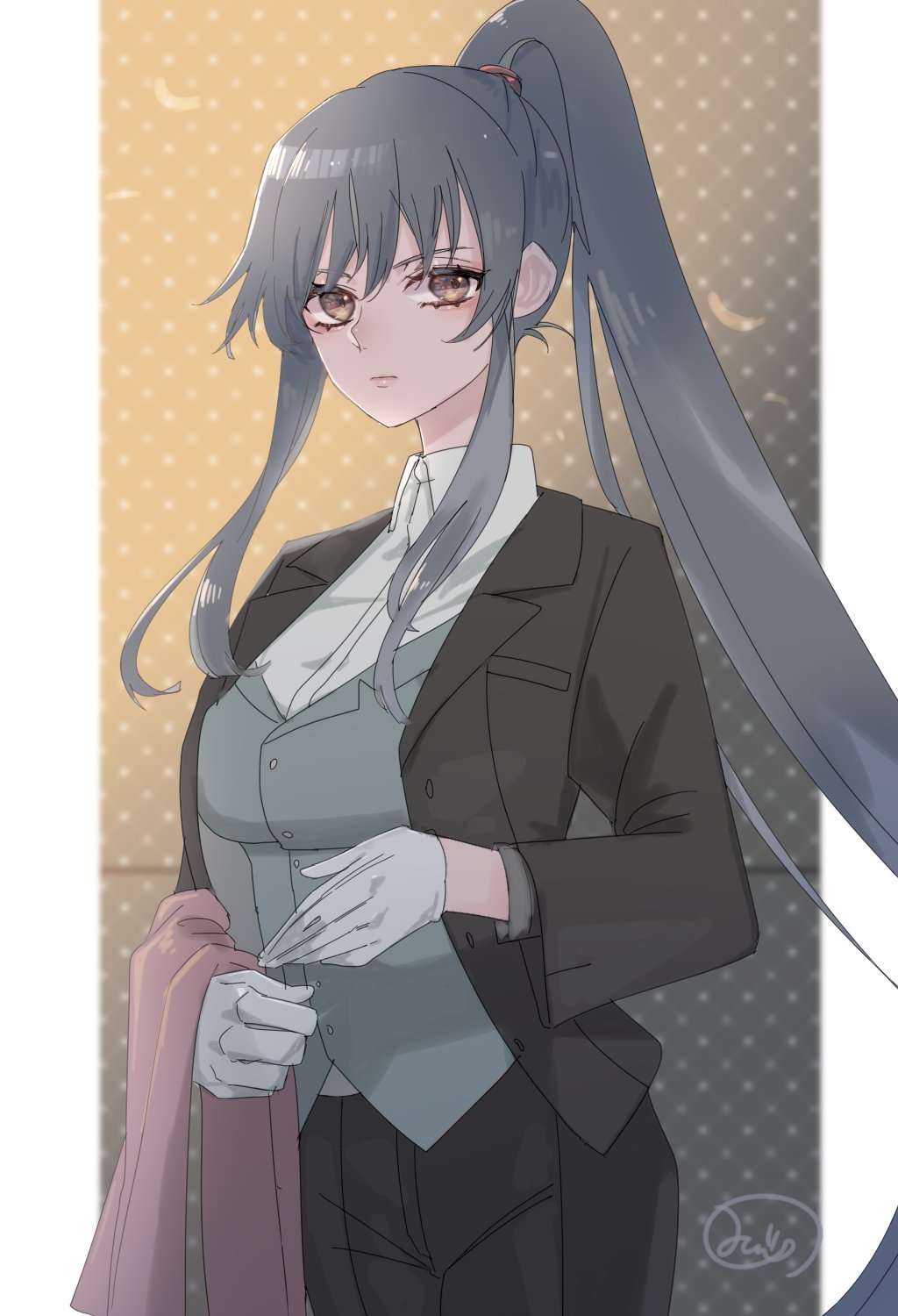 1girl alternate_costume black_hair black_jacket black_pants breasts brown_eyes butler commentary_request cowboy_shot dress_shirt formal_clothes gloves grey_vest highres jacket kantai_collection large_breasts long_hair looking_at_viewer mizoredama1 pants ponytail shirt sidelocks solo suit towel vest white_gloves white_shirt yahagi_(kancolle)