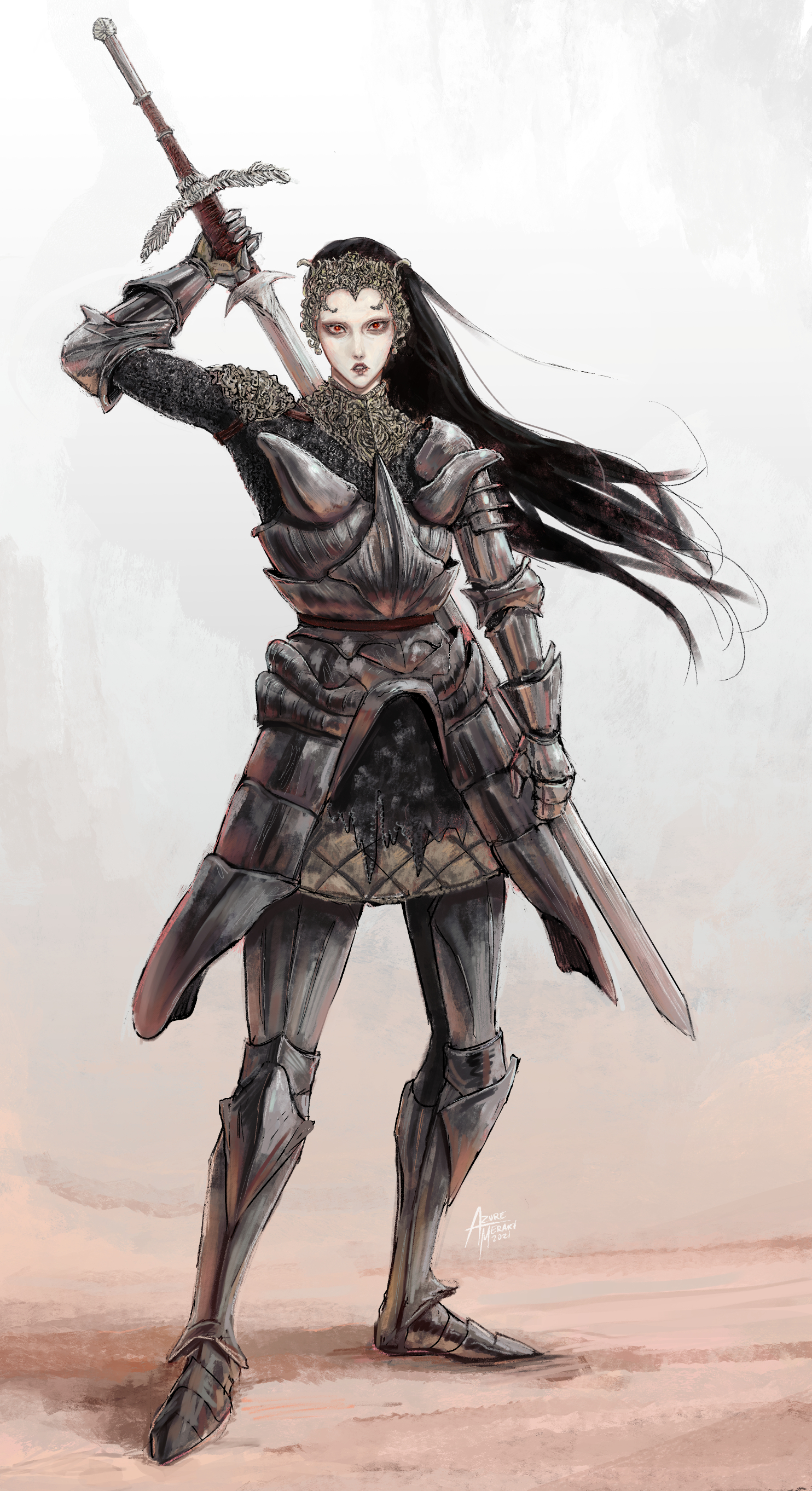 1girl absurdres armor armored_boots azure_meraki black_hair boots breastplate chainmail contrapposto dated fighting_stance floating_hair full_body gambeson gauntlets hand_up highres holding holding_behind_back holding_sword holding_sword_behind_back holding_weapon holding_weapon_behind_back long_hair looking_at_viewer original ornate_armor parted_lips red_eyes sanpaku signature solo standing sword two-handed_sword weapon zweihander