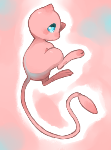 animal_focus blue_eyes blush floating from_side full_body gen_1_pokemon legendary_pokemon mew_(pokemon) mythical_pokemon nintendo no_humans outline pawpads pink_background pink_theme pokemon pokemon_(creature) puddingx2 simple_background solo white_outline