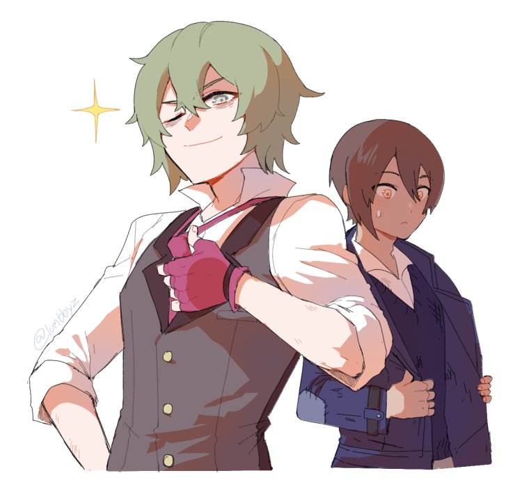 2boys ;) adjusting_clothes adjusting_necktie apollo_carson bags_under_eyes blue_jacket blue_sweater_vest brown_hair brown_vest buttons closed_mouth commentary cosplay costume_switch cropped_torso dirty dirty_clothes english_commentary fingerless_gloves gloves green_eyes green_hair hair_between_eyes jacket looking_at_viewer looking_down lumbbyz male_focus midnight_train multiple_boys necktie neil_lawton one_eye_closed patchwork_clothes pink_gloves pink_necktie popped_collar shirt short_hair simple_background sleeves_rolled_up smile sparkle sweatdrop sweater_vest twitter_username upper_body vest white_background white_shirt yellow_eyes