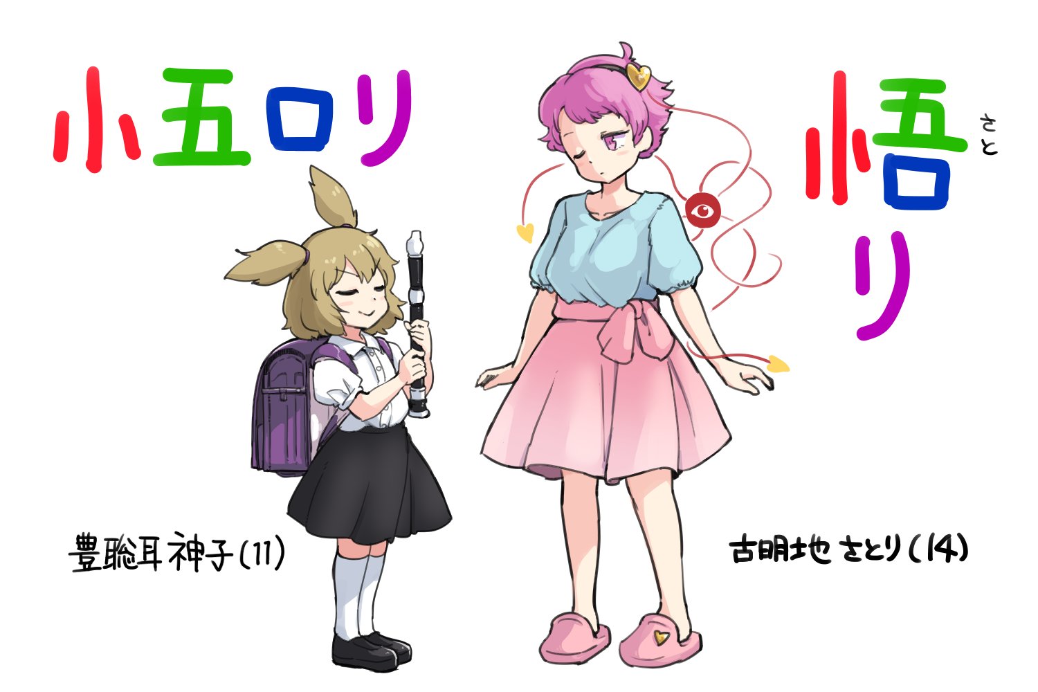 2girls age_difference aged_down alternate_kanji_reading backpack bag black_footwear black_hairband black_skirt blue_shirt blush buttons character_name closed_eyes closed_mouth collared_shirt eyeball flute hair_ornament hairband heart heart_hair_ornament holding holding_flute holding_instrument instrument itatatata komeiji_satori light_brown_hair mary_janes multiple_girls one_eye_closed pink_eyes pink_hair pink_skirt pointy_hair puffy_short_sleeves puffy_sleeves randoseru recorder shirt shoes short_hair short_sleeves simple_background skirt slippers smile thighhighs third_eye touhou toyosatomimi_no_miko translated white_background white_shirt white_thighhighs