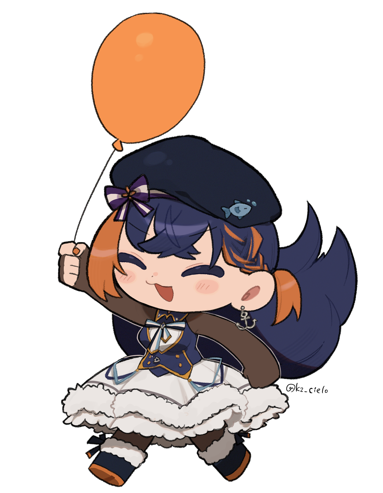 1girl :d ^_^ anchor_earrings balloon beret black_boots black_hat blue_hair blue_vest blush_stickers boots brown_pantyhose chibi closed_eyes earrings fur-trimmed_boots fur-trimmed_skirt fur_trim hat highres holding holding_balloon jewelry kiduta_cielo long_hair multicolored_hair nail_polish nijisanji nijisanji_en open_mouth orange_hair orange_nails pantyhose petra_gurin shirt skirt smile solo twitter_username two-tone_hair very_long_hair vest virtual_youtuber walking white_shirt white_skirt