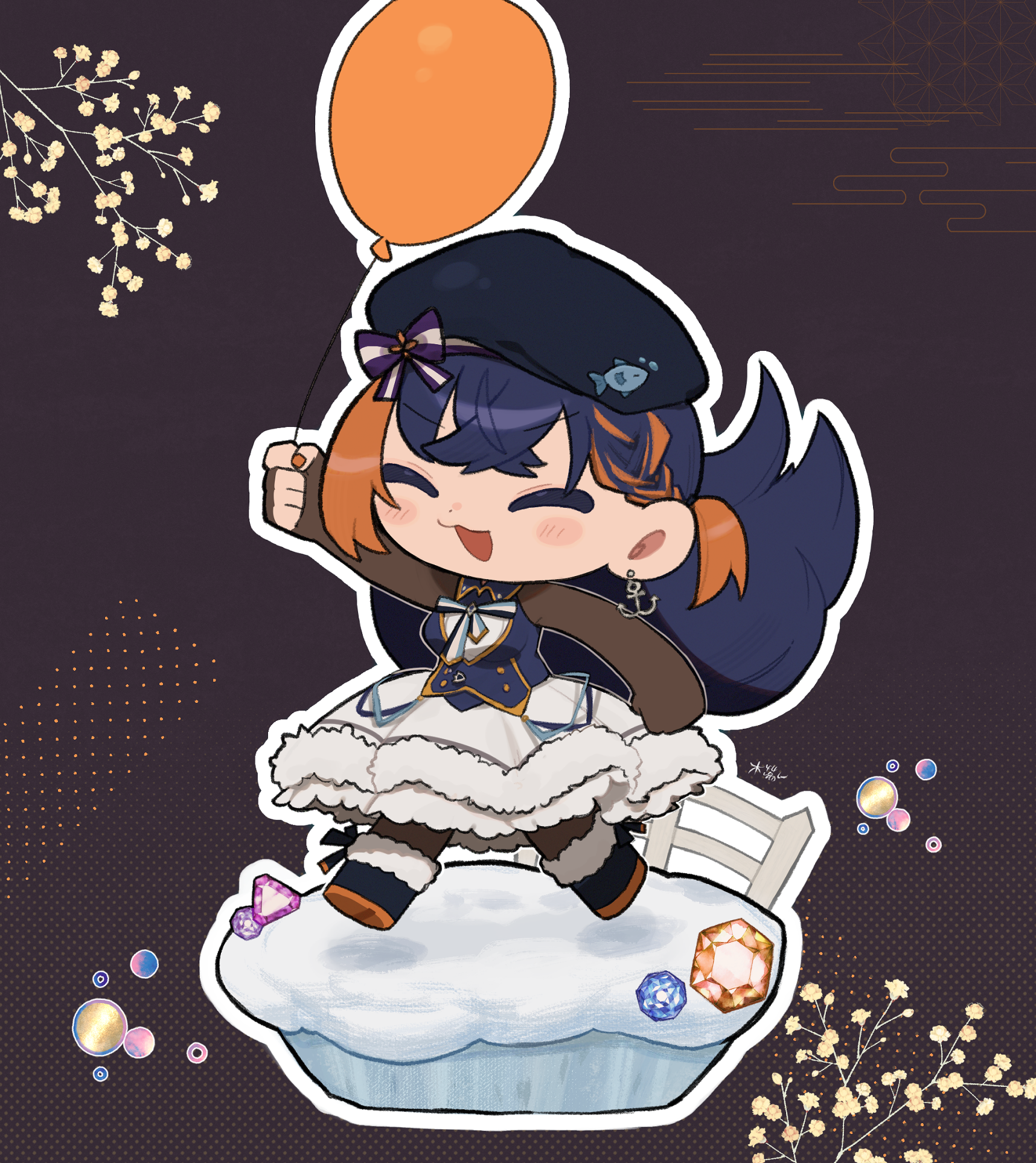 1girl :d ^_^ anchor_earrings balloon beret black_background black_boots black_hat blue_hair blue_vest blush_stickers boots brown_pantyhose chibi closed_eyes commentary_request earrings egasumi fence fur-trimmed_boots fur-trimmed_skirt fur_trim hat highres holding holding_balloon jewelry kiduta_cielo long_hair multicolored_hair nail_polish nijisanji nijisanji_en open_mouth orange_hair orange_nails outline pantyhose petra_gurin shirt skirt smile solo two-tone_hair very_long_hair vest virtual_youtuber walking white_outline white_shirt white_skirt