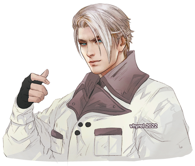 1boy artist_name asymmetrical_hair black_gloves blonde_hair blue_eyes buttons final_fantasy final_fantasy_vii final_fantasy_vii_remake fingerless_gloves gloves hair_over_one_eye hand_up high_collar jacket long_sleeves looking_at_viewer male_focus parted_bangs rufus_shinra short_hair smile solo square_enix upper_body vhyrel white_background white_jacket