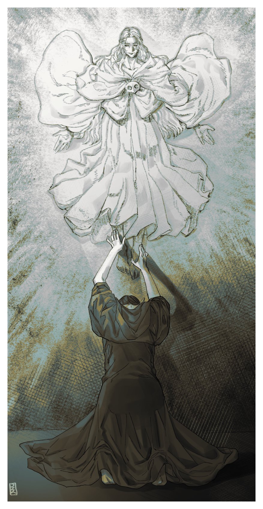 1girl 1other ambiguous_gender arms_up warrior_of_light_(ff14) barefoot black_capelet black_hair black_robe border capelet collarbone closed_eyes final_fantasy final_fantasy_xiv floating from_behind full_body half_updo highres hood hood_down hooded_capelet killer.d kneeling limited_palette long_hair long_sleeves mask mask_around_neck unworn_mask mural outstretched_arms painting_(object) reaching robe short_hair signature spread_arms straight-on venat_(ff14) wavy_hair white_border white_capelet white_hair white_robe wide_sleeves
