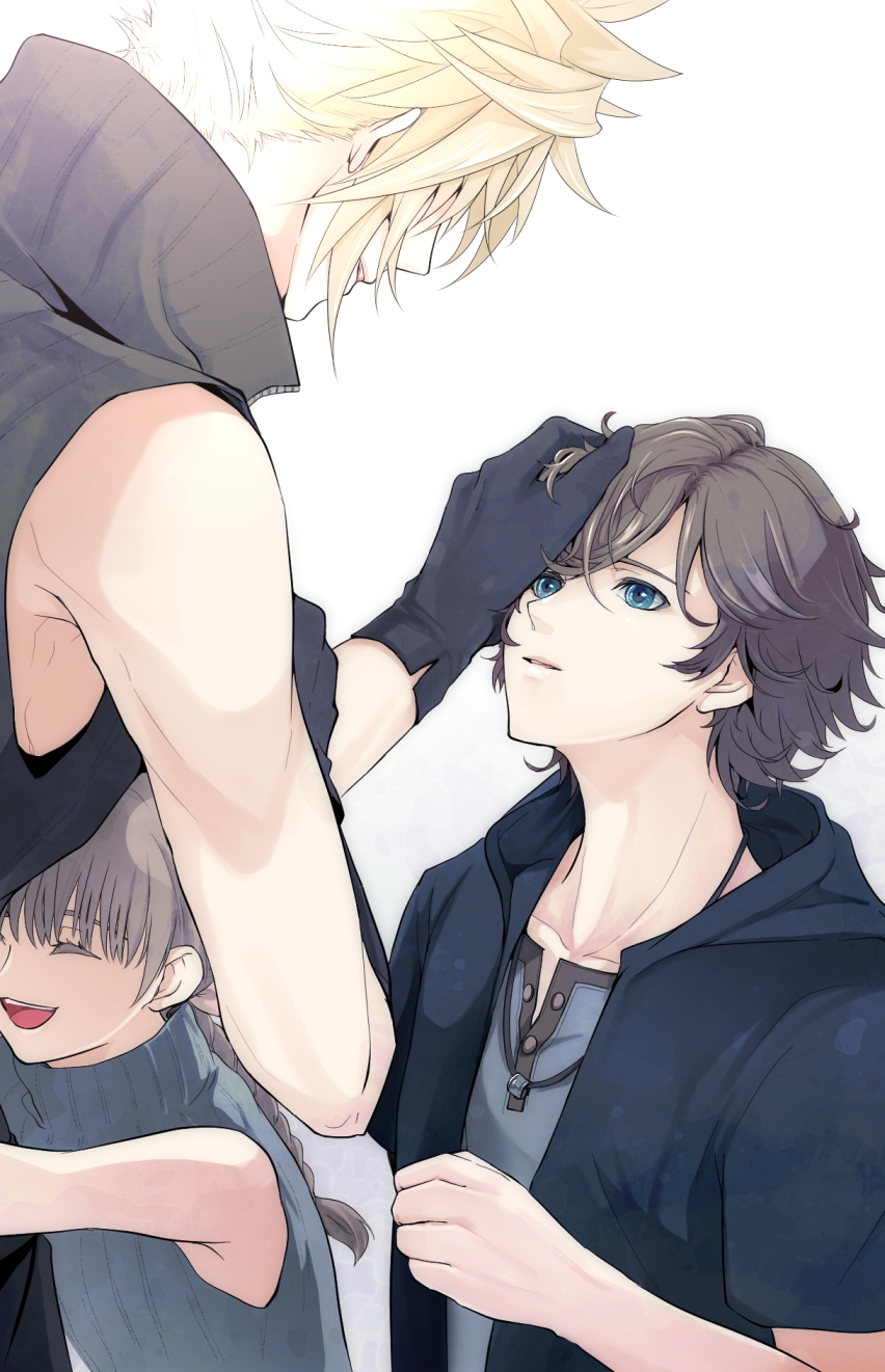 1girl 2boys armpits bare_arms black_gloves black_hoodie blonde_hair blue_eyes blunt_bangs braid braided_ponytail brown_hair child closed_eyes cloud_strife denzel_(ff7) dress final_fantasy final_fantasy_vii final_fantasy_vii:_advent_children gloves grey_dress grey_shirt hair_between_eyes hair_ribbon hand_on_another's_head high_collar highres hood hood_down hoodie hug i_ne_rrr jewelry long_hair looking_at_another marlene_wallace multiple_boys necklace open_mouth parted_lips pink_ribbon ribbon shirt short_hair short_sleeves sleeveless sleeveless_dress sleeveless_shirt smile spiked_hair square_enix turtleneck turtleneck_dress upper_body wavy_hair white_background