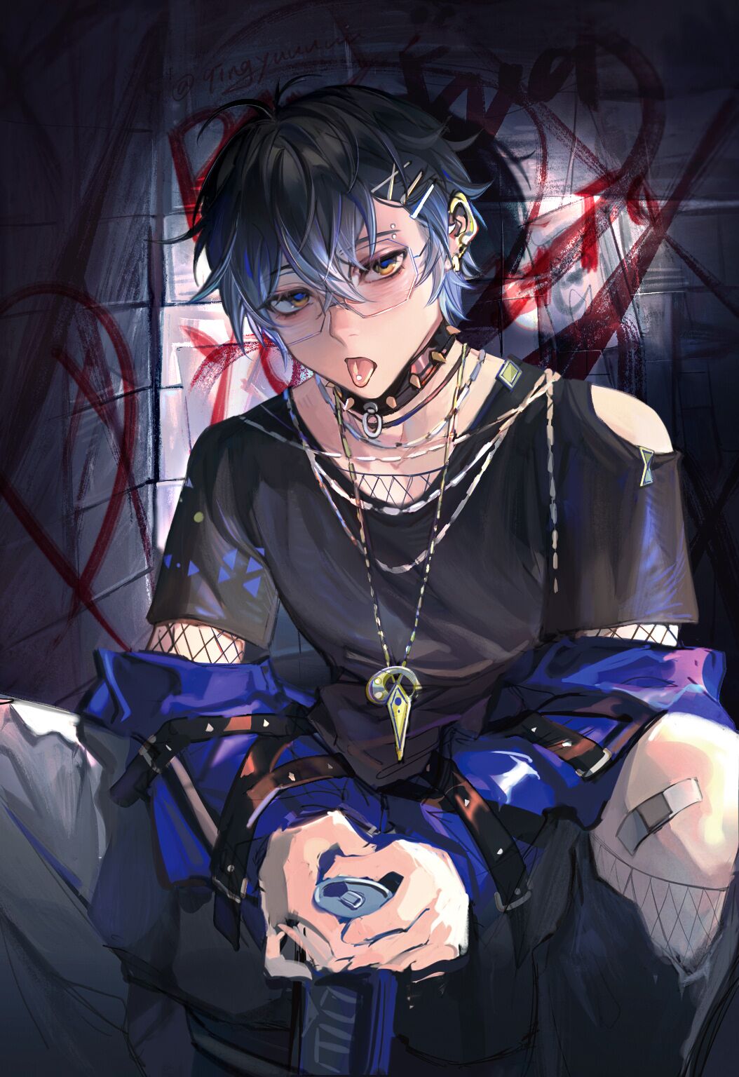 1boy ahoge bad_anatomy bad_hands bandaid bandaid_on_knee bandaid_on_leg black_hair black_shirt blue_eyes blue_hair blue_jacket bodystocking can clothing_cutout collar earrings eyebrow_piercing face_piercing fishnet_bodystocking fishnet_socks fishnets glasses graffiti grey_pants hair_ornament hairpin highres holding holding_can ike_eveland jacket jacket_partially_removed jewelry knee_cutout looking_at_viewer male_focus multicolored_eyes multicolored_hair necklace nijisanji nijisanji_en nose pants piercing punk qingyu shirt short_hair shoulder_cutout socks solo spiked_collar spikes tongue tongue_out tongue_piercing twitter_username virtual_youtuber x_hair_ornament yellow_eyes