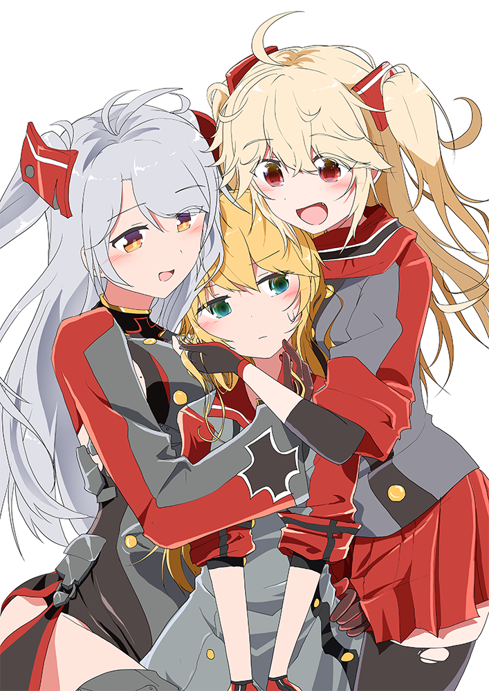 3girls :d admiral_hipper_(azur_lane) antenna_hair azur_lane black_choker blonde_hair bluecher_(azur_lane) blush breasts buttons choker clothing_cutout cross cross_earrings double-breasted earrings fang girl_sandwich green_eyes hat hug iron_cross jewelry long_hair long_sleeves mole mole_on_breast multicolored_hair multicolored_scarf multiple_girls open_mouth orange_eyes peaked_cap prinz_eugen_(azur_lane) red_eyes red_hair sandwiched scarf side_cutout sideboob smile split-color_hair streaked_hair thighhighs toro_yurei two_side_up white_hair