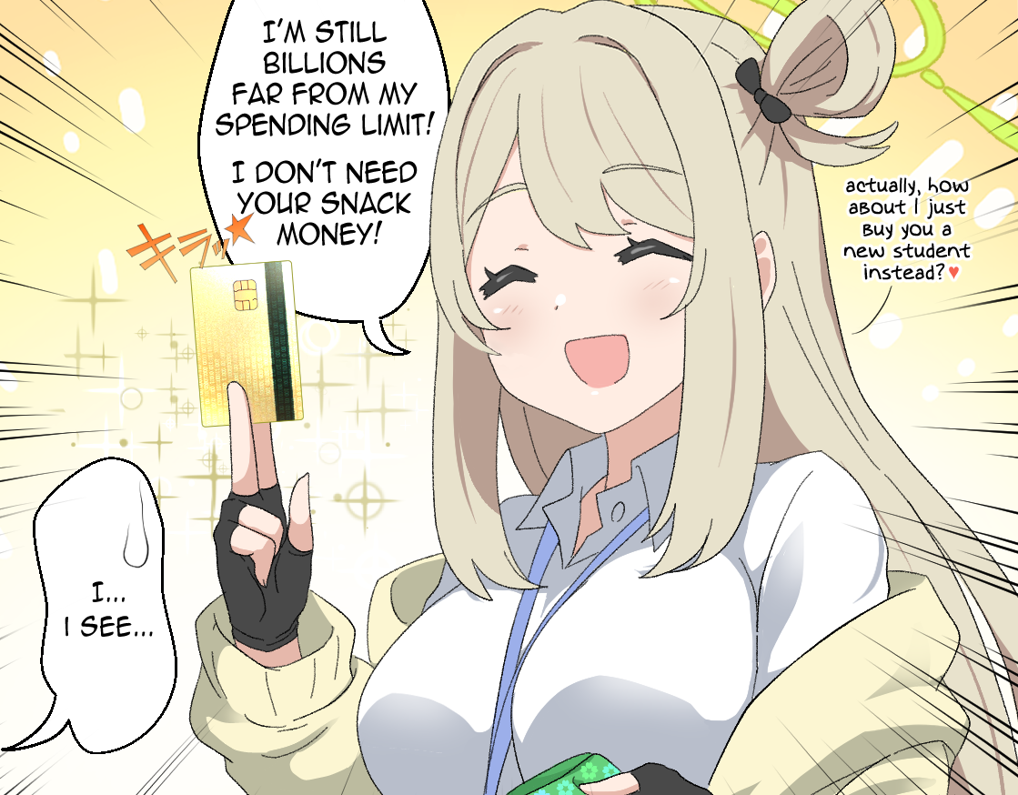 1girl alph_(sancheck) blonde_hair blue_archive card closed_eyes comic credit_card english_text long_hair nonomi_(blue_archive) smile solo upper_body very_long_hair