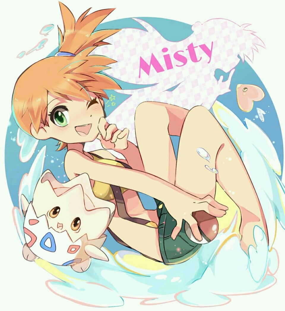 1girl aokurage_1201 asymmetrical_hair bad_id bad_pixiv_id breasts denim denim_shorts gen_2_pokemon gen_3_pokemon green_eyes green_shorts luvdisc misty_(pokemon) navel nintendo pokemon pokemon_(anime) pokemon_(classic_anime) ponytail shirt shoes short_hair short_shorts shorts side_ponytail solo suspender_shorts suspenders tank_top togepi yellow_shirt