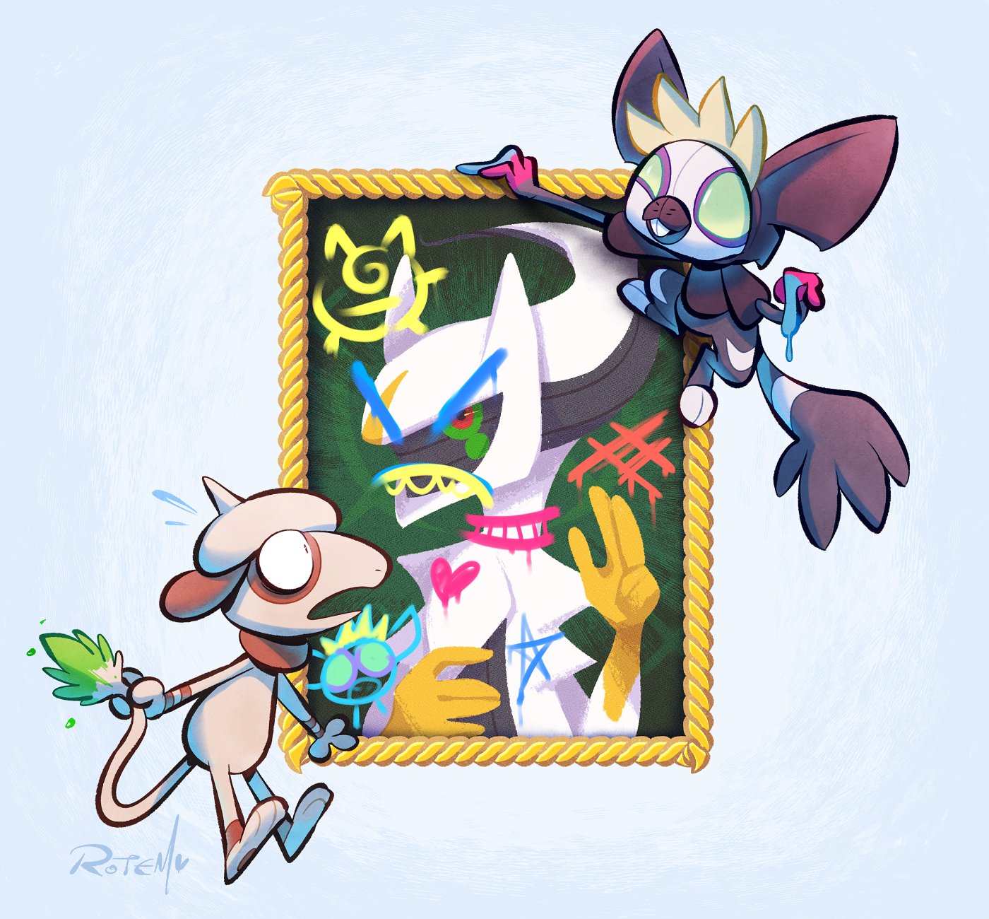 arceus character_print commentary drawing_(object) flying_sweatdrops gen_2_pokemon gen_4_pokemon grafaiai graffiti green_eyes hanging highres holding legendary_pokemon mythical_pokemon nintendo no_humans open_mouth paint picture_frame pokemon pokemon_(creature) signature smeargle tail tail_grab vaporotem