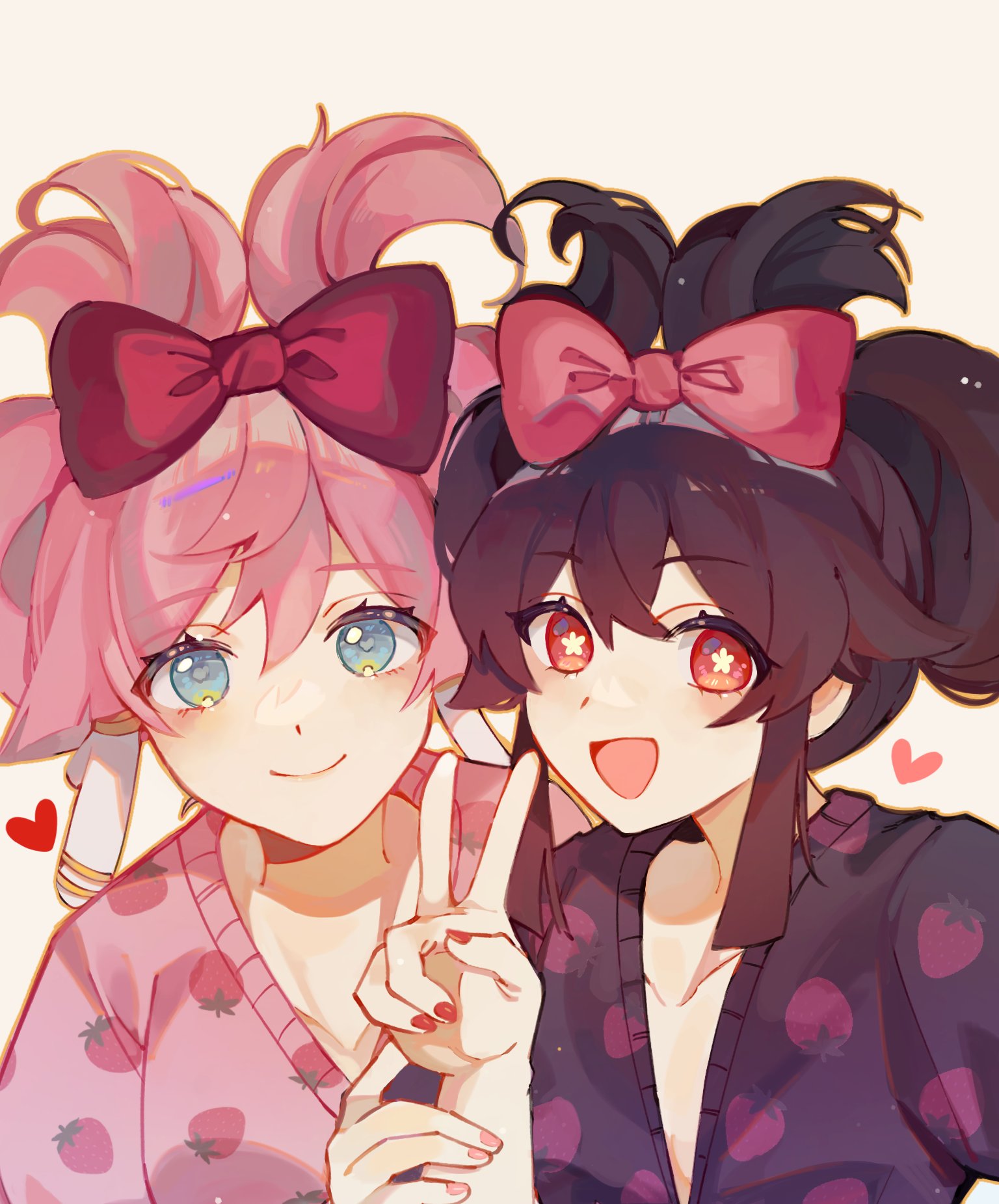 2girls antlers blue_eyes blush borrowed_hairstyle bow brown_hair chanh_(ladonna) cinnamiku_hairstyle cinnamoroll closed_mouth collarbone commentary english_commentary eyelashes flower-shaped_pupils folded_twintails food_print fruit_print fuwa_fuwa_cinnamoroll genshin_impact heart highres horns hu_tao_(genshin_impact) lirika_matoshi_strawberry_dress long_hair long_sleeves looking_at_viewer multiple_girls nail_polish pink_bow pink_hair pink_nails red_bow red_nails sanrio sidelocks simple_background smile strawberry_print symbol-shaped_pupils updo v white_background yanfei_(genshin_impact)
