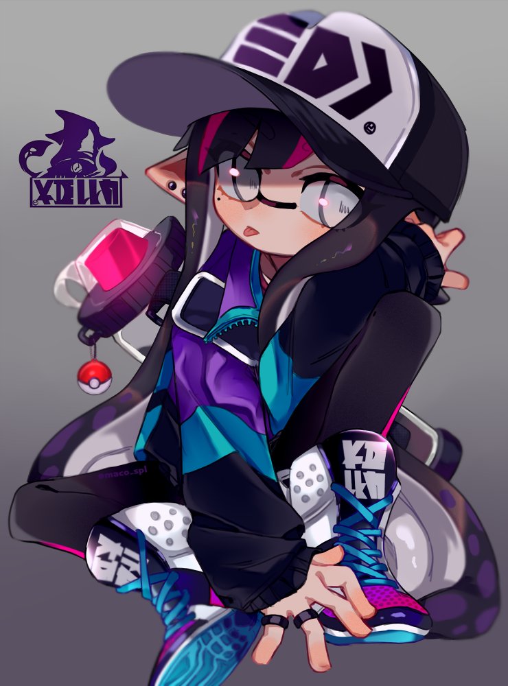 1girl artist_name averting_eyes baseball_cap black_leggings blunt_bangs blurry blush charm_(object) closed_mouth clothes_writing depth_of_field earrings female_focus full_body gradient_background grey_background grey_eyes hand_up hat ink_tank_(splatoon) inkling inkling_girl inkling_player_character jacket jewelry knee_up leggings light_blush logo long_sleeves looking_to_the_side maco_spl mole mole_under_eye multicolored_hair multicolored_jacket multicolored_shoes multiple_earrings multiple_rings nintendo open_clothes open_jacket pink_hair pointy_ears poke_ball poke_ball_(basic) pokemon purple_hair ring shoes sidelocks simple_background sitting sleeves_past_wrists sneakers solo splatoon_(series) spread_legs streaked_hair stud_earrings suction_cups tentacle_hair tentacles tongue tongue_out twintails twitter_username two-tone_hair watermark zipper
