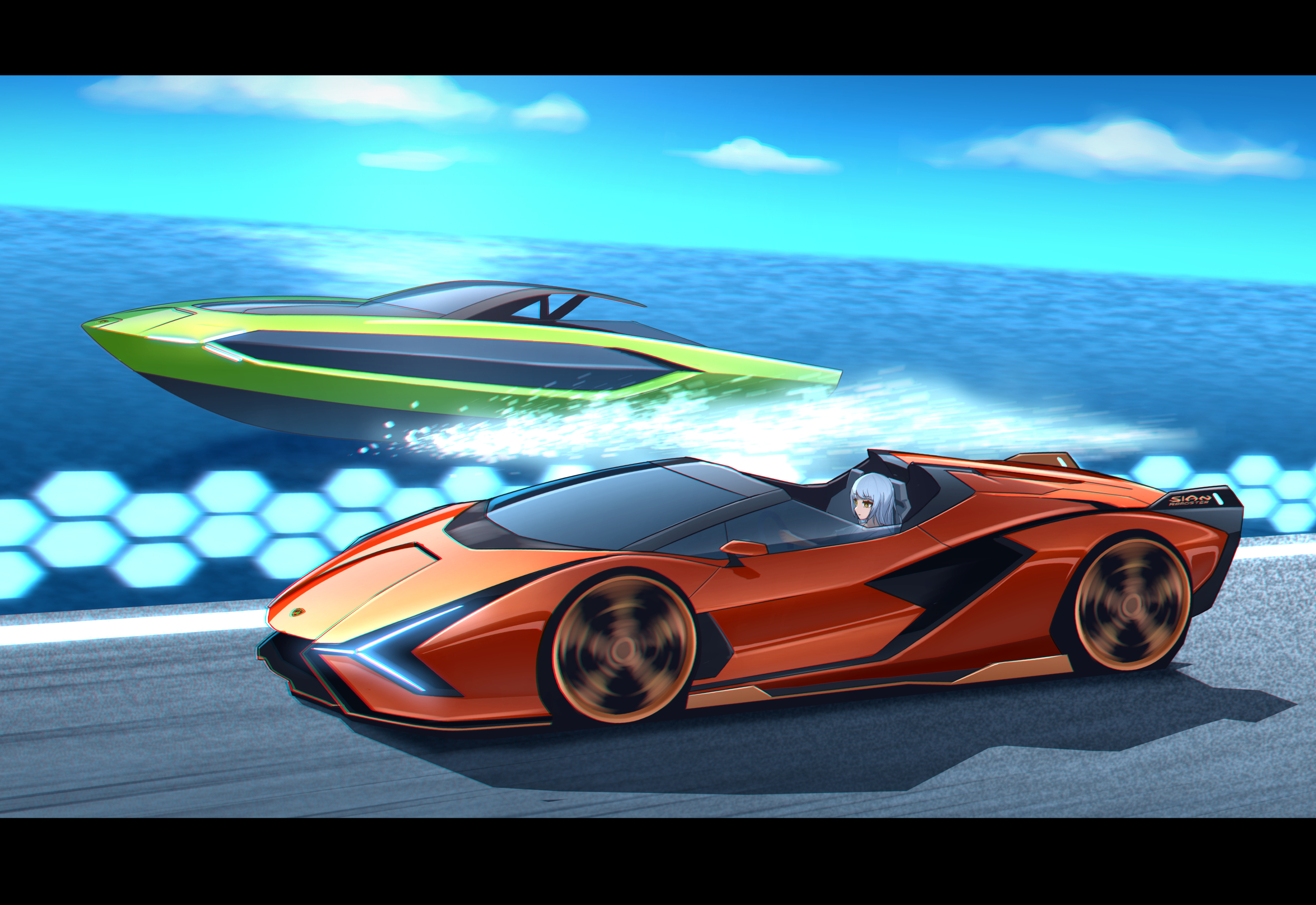 1girl blue_hair boat car commentary_request convertible driving highres kai55 lamborghini lamborghini_sian letterboxed long_hair motor_vehicle ocean original outdoors revision sports_car summer vehicle_focus water watercraft yellow_eyes