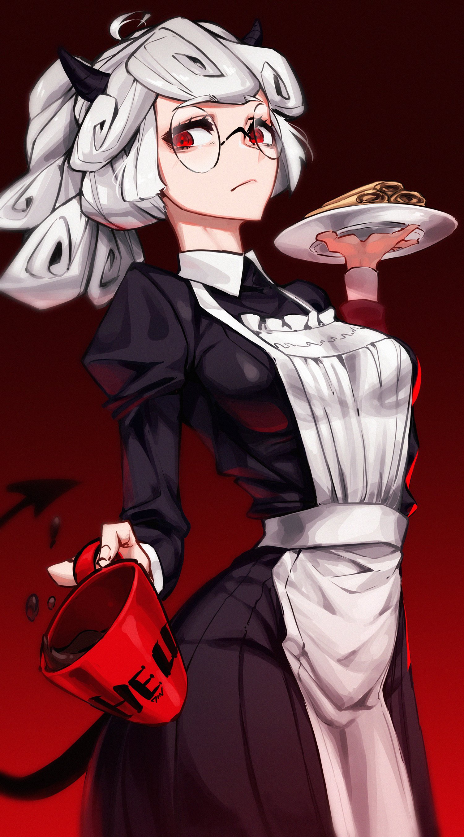 1girl absurdres apron black_horns coffee cup demon_girl demon_horns demon_tail food helltaker highres horns maid maid_apron mug pancake pandemonica_(helltaker) pear-shaped_figure plate red_eyes round_eyewear tail white_hair xraydreads