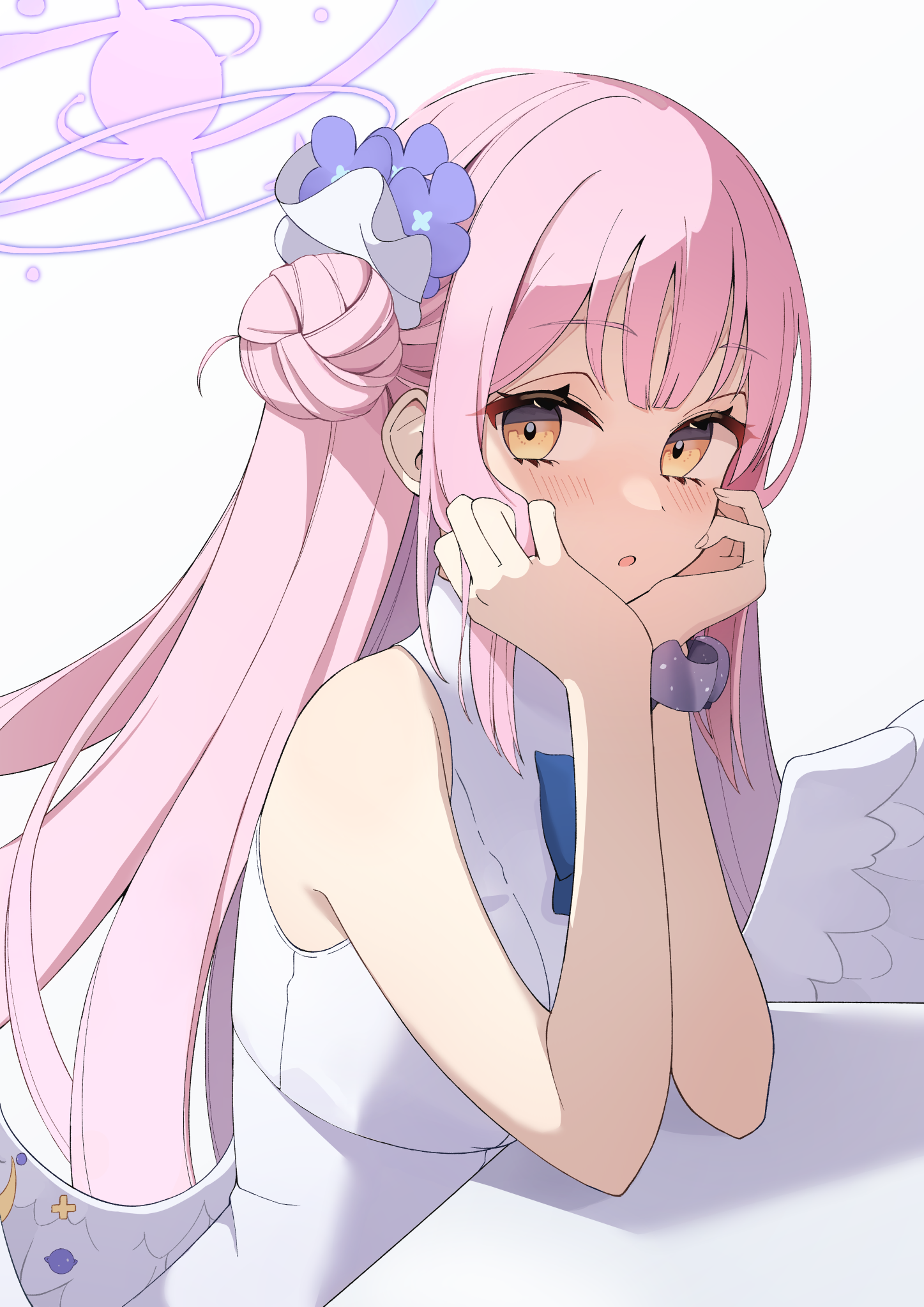 angel_wings black_scrunchie blue_archive dress feathered_wings flower hair_bun hair_flower hair_ornament halo highres long_hair low_wings mika_(blue_archive) pink_hair sasai_nakoto scrunchie single_hair_bun single_side_bun sleeveless sleeveless_dress very_long_hair white_dress white_wings wings wrist_scrunchie yellow_eyes