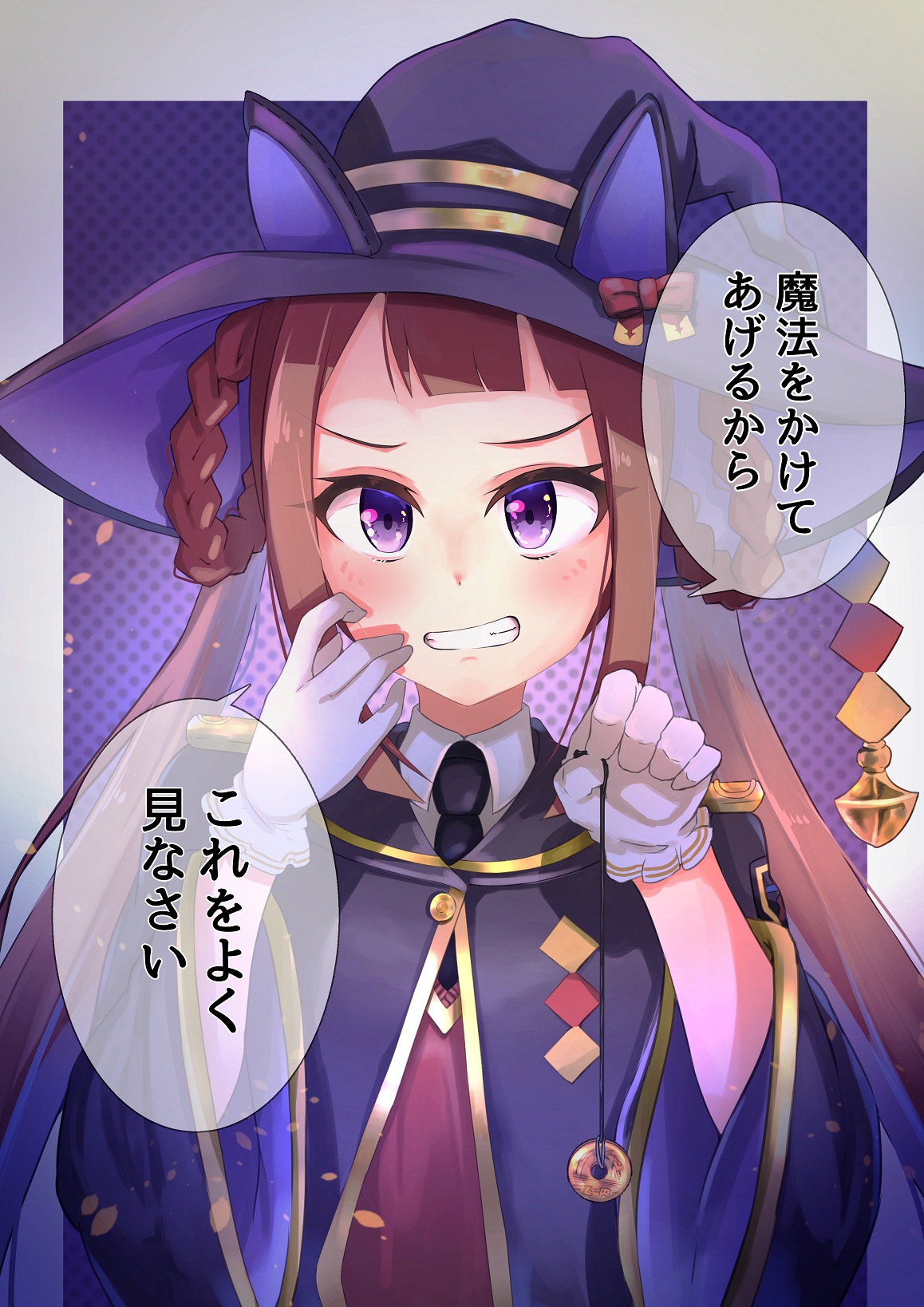 1girl animal_ears blush breasts brown_hair commentary_request gloves grin heart highres horse_ears horse_girl hypnosis kamisu_yu looking_at_viewer mind_control portrait purple_eyes simple_background small_breasts smile solo sweep_tosho_(platanus_witch)_(umamusume) sweep_tosho_(umamusume) translation_request twintails umamusume white_gloves