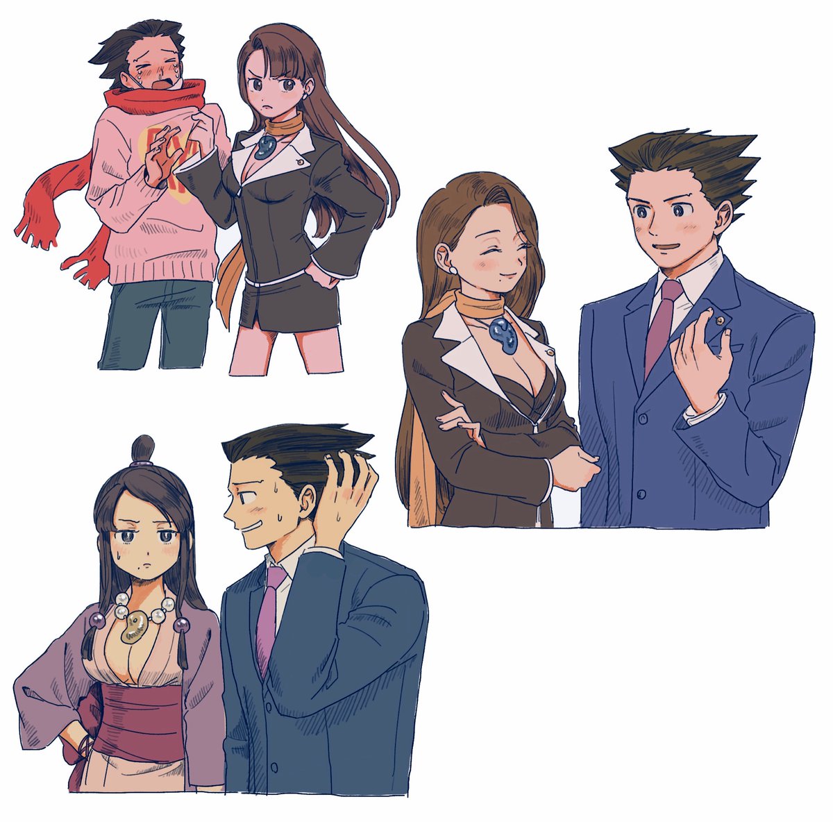 1boy 2girls ace_attorney black_hair blush breasts brown_hair cleavage closed_eyes earrings formal_clothes hair_ornament jewelry long_hair maya_fey mia_fey mole mole_under_mouth multiple_girls multiple_views necklace necktie nervous_sweating orange_scarf pants phoenix_wright red_scarf renshu_usodayo scarf skirt skirt_suit smile sphere_hair_ornament spiked_hair suit sweat sweater tears