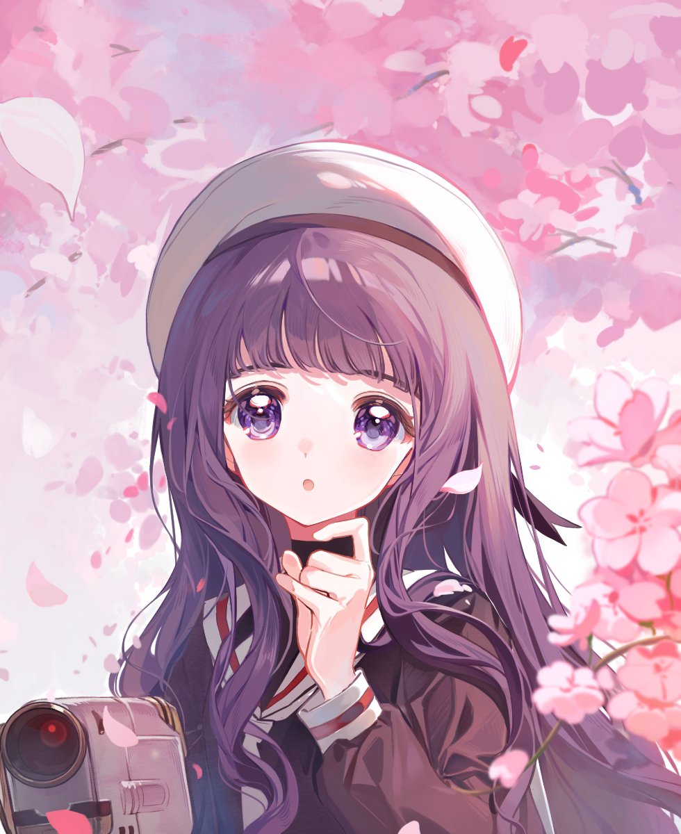 1girl :o blush cardcaptor_sakura cheese765 cherry_blossoms child daidouji_tomoyo flower highres looking_at_viewer outdoors pink_flower purple_eyes purple_hair sailor_collar school_uniform serafuku solo tomoeda_elementary_school_uniform tomoeda_middle_school_uniform video_camera white_headwear white_sailor_collar