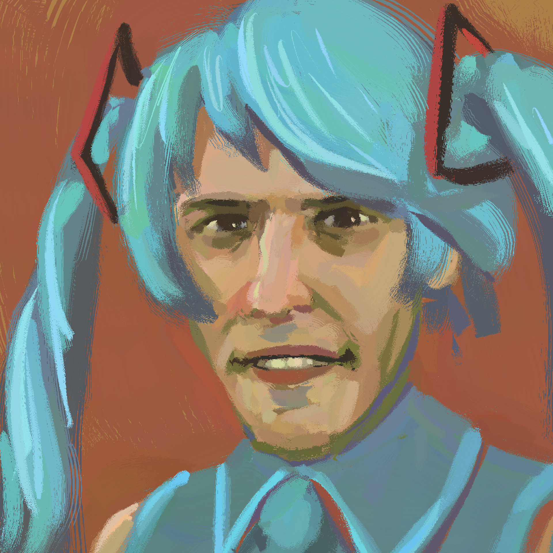 1boy aqua_hair brown_background brown_eyes collared_shirt commentary cosplay crossdressing crossdressing_(mtf) english_commentary gooseygang hatsune_miku hatsune_miku_(cosplay) highres jerma985 jerma985_(person) looking_at_viewer open_mouth portrait real_life shirt sleeveless sleeveless_shirt teeth twintails vocaloid