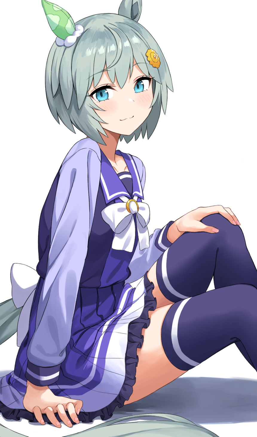 1girl animal_ears aqua_eyes bow bowtie closed_mouth feet_out_of_frame fuyutuji green_hair hair_ornament hairclip highres horse_ears horse_girl horse_tail knees_up long_sleeves looking_at_viewer purple_shirt purple_skirt purple_thighhighs sailor_collar school_uniform seiun_sky_(umamusume) shadow shirt short_hair simple_background sitting skirt smile solo tail thighhighs tracen_school_uniform umamusume white_background zettai_ryouiki