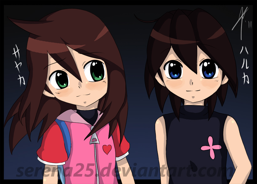 2girls alternate_hairstyle artist_name blue_eyes blush green_eyes haruka_(saru_getchu) japanese_text looking_at_viewer medium_hair multiple_girls saru_getchu sayaka_(saru_getchu) short_hair sleeveless smile translated watermark