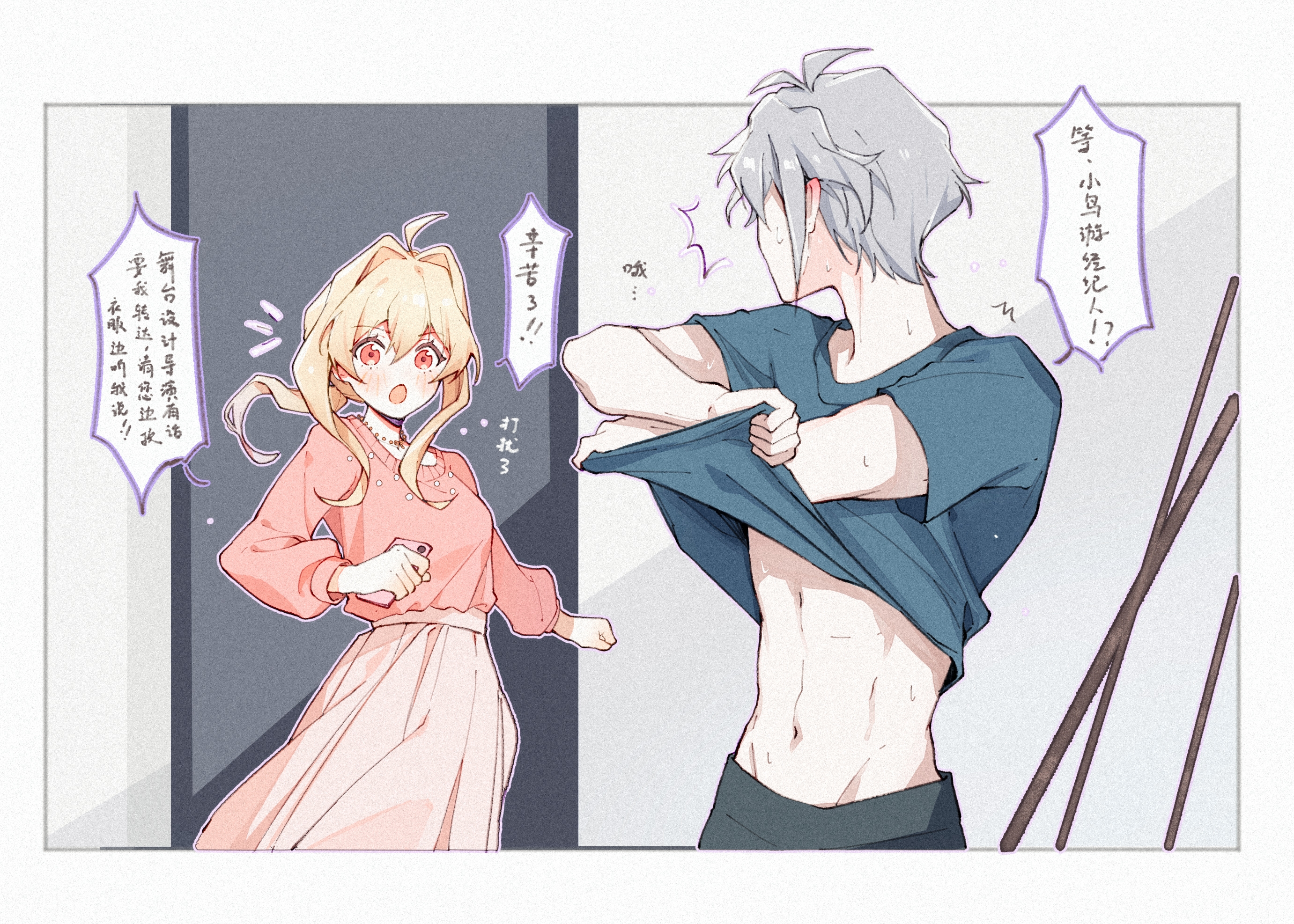 1boy 1girl blonde_hair clothes_lift dress highres idolish7 lifting_own_clothes long_hair mature_male open_mouth red_eyes ruidijintianyehaofei short_hair takanashi_tsumugi yaotome_gaku