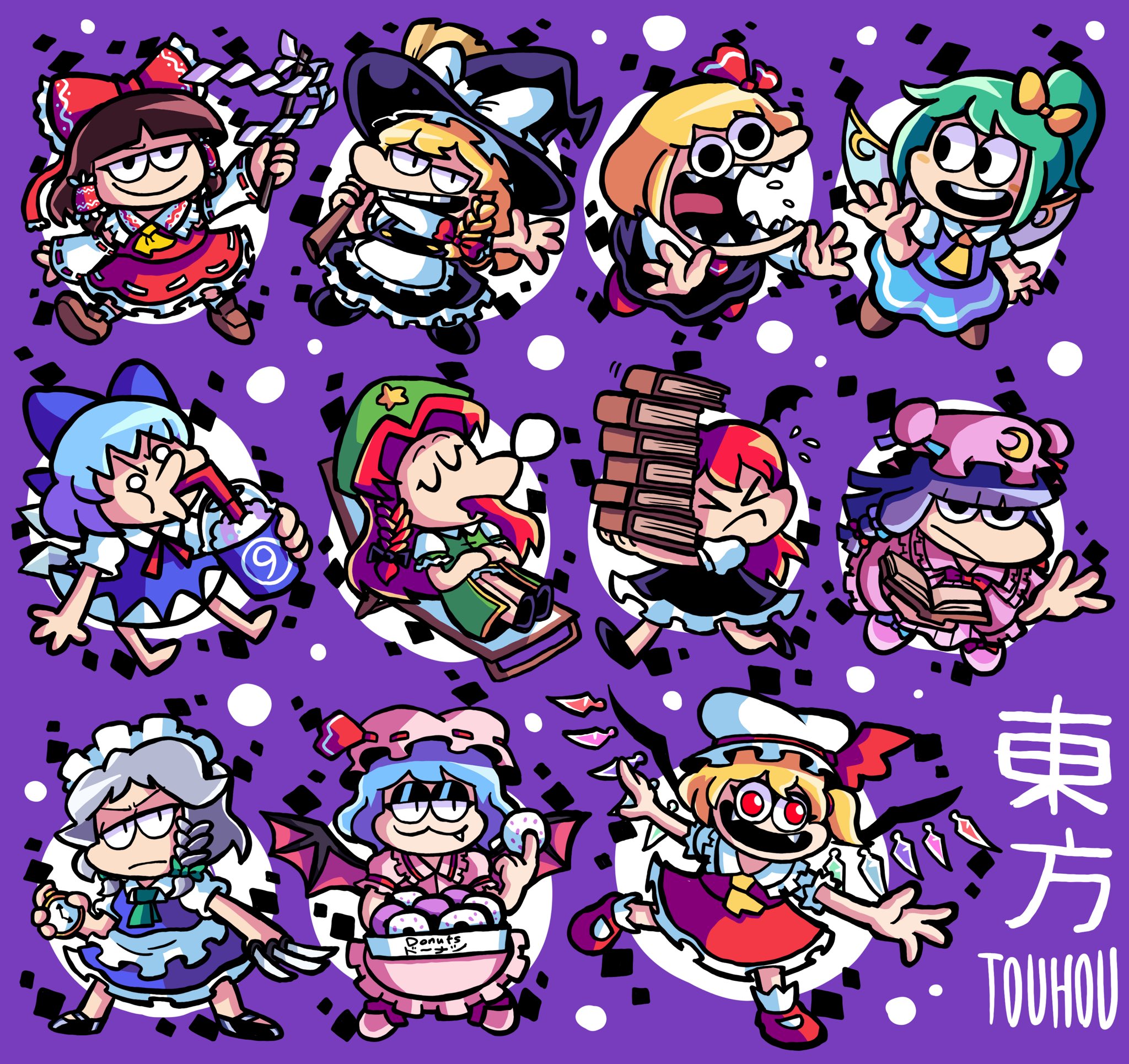 >_< 6+girls 6_9 :3 apron ascot barefoot bat_wings black_bow black_eyeshadow black_headwear black_skirt blonde_hair blue_dress blue_hair book bow box braid broom brown_hair chinese_clothes circle circled_9 cirno closed_eyes closed_mouth collared_shirt copyright_name crescent crescent_hat_ornament daiyousei demon_wings diamond_(shape) donut dress drink drinking drinking_straw drooling embodiment_of_scarlet_devil english_text everyone eyeshadow fairy_wings fang fangs fewer_digits fighting_stance flandre_scarlet food frilled_bow frilled_dress frilled_hair_tubes frills gohei green_hair green_headwear grey_hair hair_bow hair_ribbon hair_tubes hakurei_reimu hat hat_bow hat_ornament hat_ribbon head_wings highres holding holding_book holding_box holding_broom holding_drink holding_food holding_gohei holding_pocket_watch hong_meiling ice ice_wings izayoi_sakuya jitome josh-s26 kirisame_marisa knife koakuma long_hair long_sleeves maid_headdress makeup mary_janes medium_hair mob_cap multiple_girls nose_bubble o3o o_o open_mouth outstretched_arms patchouli_knowledge pinafore_dress pink_headwear pink_skirt pocket_watch puffy_short_sleeves puffy_sleeves purple_background purple_hair red_bow red_dress red_eyes red_hair red_ribbon remilia_scarlet ribbon rumia sharp_teeth shirt shoes short_hair short_sleeves side_braid sidelocks single_braid skirt sleeping sleeveless_dress smile socks solid_circle_pupils spread_arms sr_pelo_(style) star_(symbol) star_hat_ornament teeth touhou waist_apron watch white_apron white_bow white_headwear white_shirt wings witch_hat yellow_ascot yellow_bow