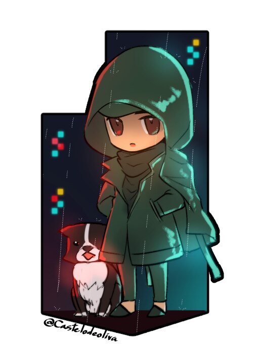 1girl brown_eyes camus_(cloudpunk) cloudpunk dog raincoat rania_(cloudpunk) tagme