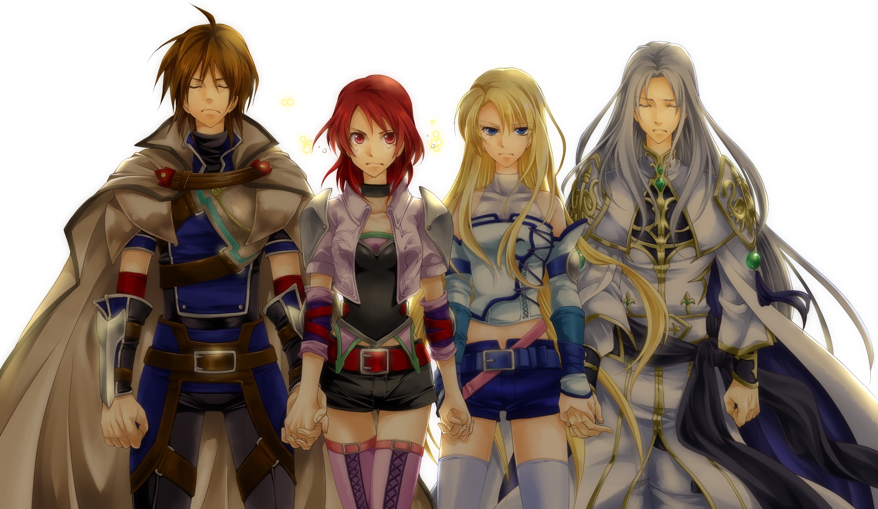 2boys 2girls armor belt belt_buckle black_choker black_pants black_shorts blonde_hair blue_belt blue_eyes blue_shorts brown_cape brown_hair buckle cape choker closed_eyes closed_mouth collarbone cowboy_shot crying crying_with_eyes_open densetsu_no_yuusha_no_densetsu ferris_eris floating_hair frown grey_hair highres jacket kiefer_knolles long_hair looking_at_viewer mekeko midriff multiple_boys multiple_girls open_clothes open_jacket pants pink_thighhighs red_belt red_eyes red_hair ryner_lute short_shorts shorts shoulder_armor simple_background sion_astal standing stomach straight_hair tears thighhighs very_long_hair white_background white_jacket white_thighhighs zettai_ryouiki