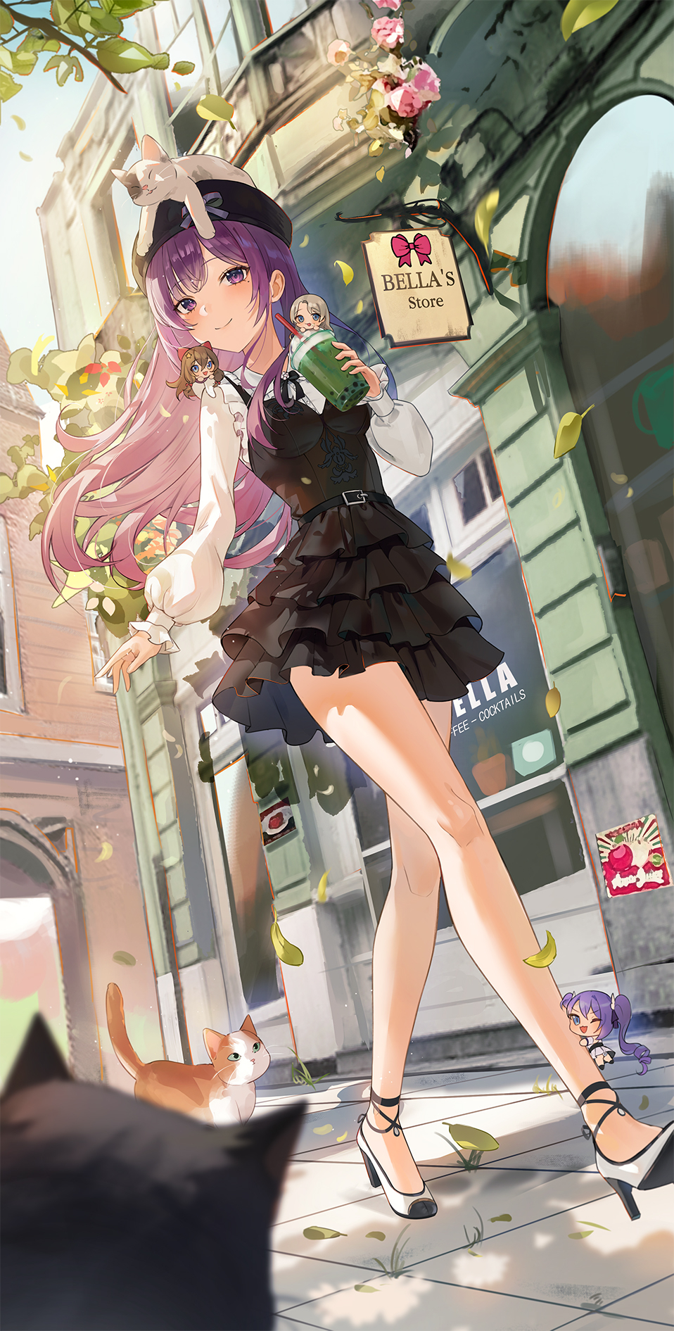 4girls :d animal animal_on_head beret black_cat black_dress black_headwear blue_eyes breasts brown_hair bubble_tea cat closed_mouth collared_shirt commission cup day disposable_cup dress dress_shirt drinking_straw falling_leaves grey_hair hair_between_eyes hat high_heels highres holding holding_cup layered_dress leaf long_sleeves medium_breasts mrr_05 multiple_girls on_head open_mouth original outdoors parted_bangs petals pleated_dress pleated_skirt puffy_long_sleeves puffy_sleeves purple_eyes purple_hair shirt shoes skirt sleeves_past_wrists smile white_footwear white_shirt white_skirt window
