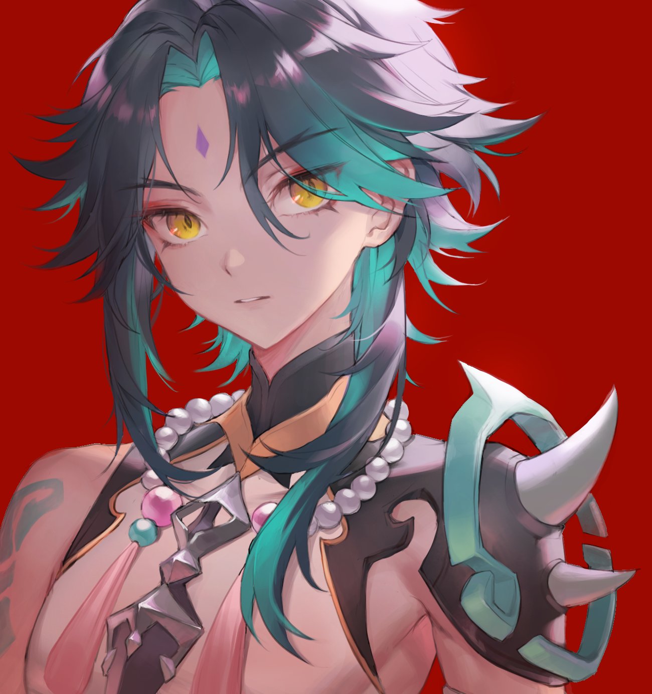 1boy arm_tattoo bead_necklace beads black_hair facial_mark forehead_mark genshin_impact green_hair highres jewelry korean_commentary looking_at_viewer male_focus miji_black multicolored_hair necklace parted_lips red_background simple_background solo spikes tassel tattoo upper_body xiao_(genshin_impact) yellow_eyes