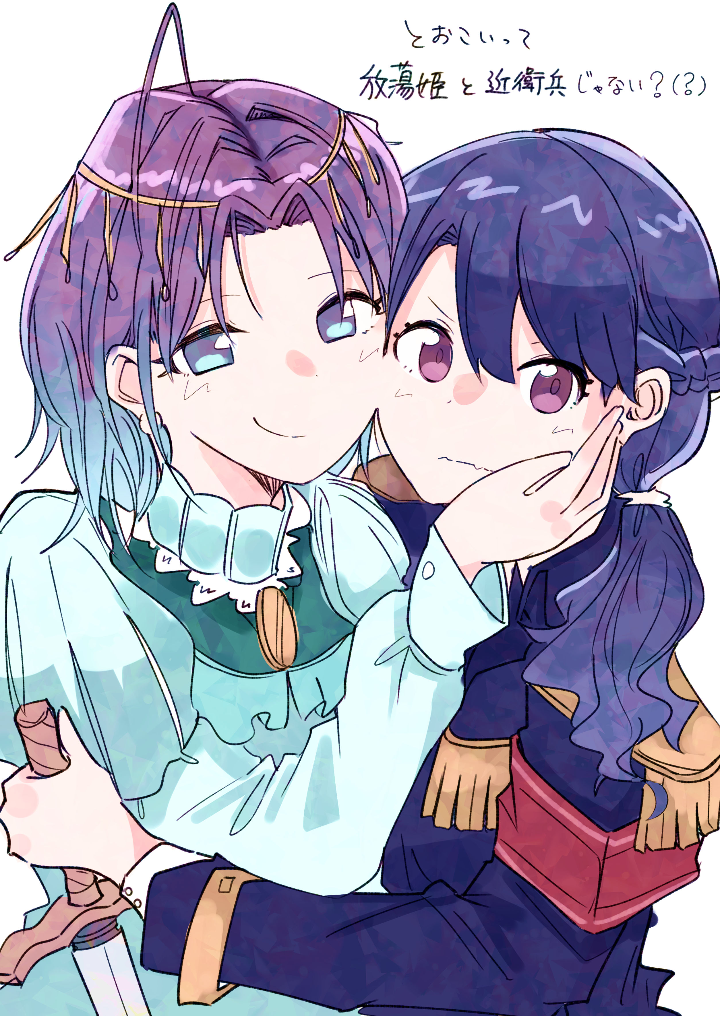 2girls a9mer absurdres ahoge asakura_toru black_hair blue_hair braid commentary_request earrings epaulettes fangs fukumaru_koito gradient_hair hair_over_shoulder hand_on_another's_cheek hand_on_another's_face highres idolmaster idolmaster_shiny_colors jewelry juliet_sleeves long_hair long_sleeves looking_at_viewer multicolored_hair multiple_girls puffy_sleeves purple_eyes purple_hair short_hair skin_fangs smile sword weapon white_background