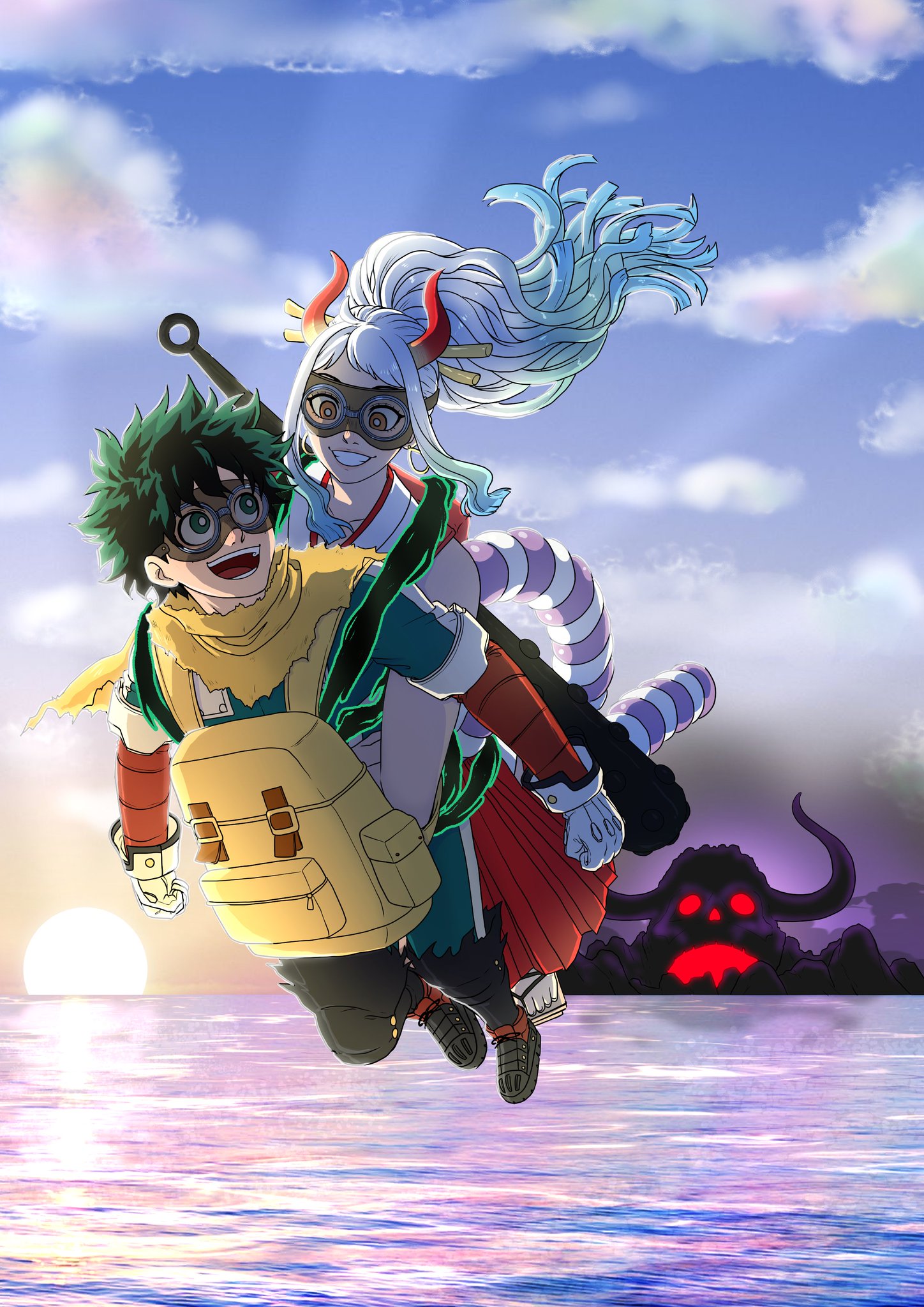 boku_no_hero_academia cloud cloudy_sky club club_(weapon) crossover flying goggles green_eyes green_hair highres kanabou midoriya_izuku ocean one_piece onigashima orange_eyes sakurarose12 scarf sky smile sunrise tagme weapon white_hair yamato_(one_piece)