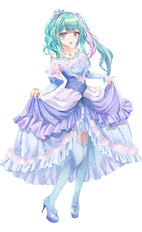 1girl aqua_hair blue_dress blush dress full_body high-low_dress high_heels holding_own_dress lace long_hair mizuki_elsha multicolored_hair nekonote_(vtuber) off-shoulder_dress off_shoulder official_art open_mouth pink_hair purple_eyes second-party_source short_braid side_ponytail thighhighs tiara torino_aqua transparent_background virtual_youtuber