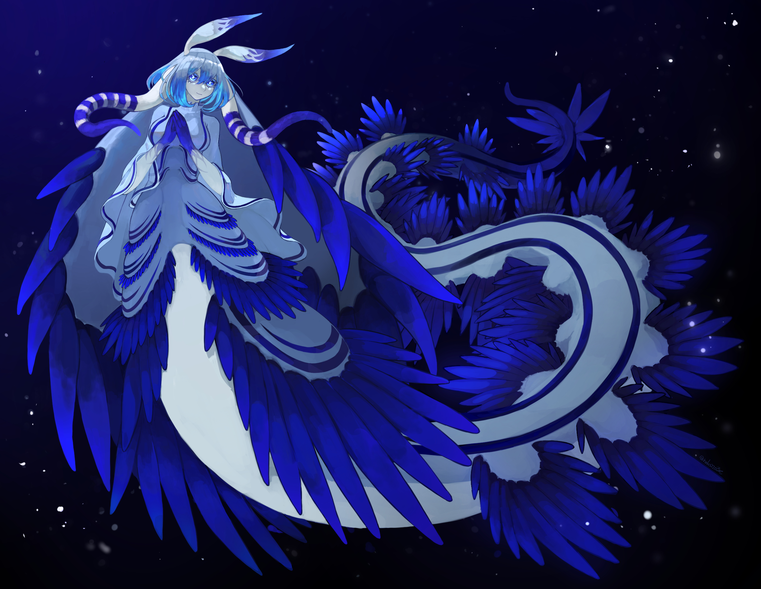 1girl black_background blue_eyes blue_hair blue_skin bright_pupils bubble colored_eyelashes colored_inner_hair colored_skin commission fins frilled_shirt_collar frills full_body gills glaucus_atlanticus grey_hair hands_up head_fins highres long_sleeves looking_at_viewer monster_girl multicolored_hair multicolored_skin original own_hands_together ruteko_(ruko220) sea_slug_girl short_hair simple_background skeb_commission solo tentacles two-tone_hair underwater white_pupils white_skin wide_sleeves