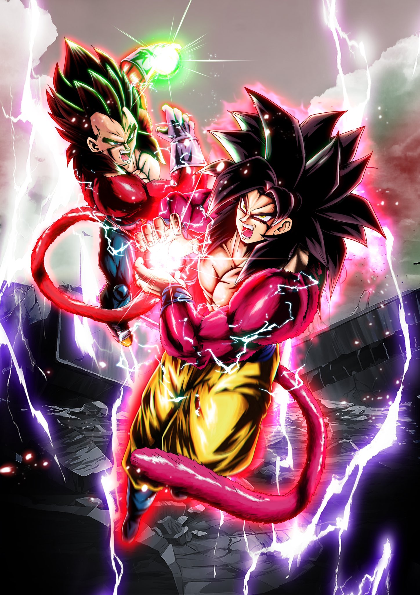 aura black_hair body_fur dougi dragon_ball dragon_ball_gt ego_vegeta energy_ball energy_beam final_shine_attack highres incoming_attack kamehameha_(dragon_ball) kamehameha_10x monkey_boy monkey_tail multiple_boys muscular muscular_male powering_up red_fur son_goku spiked_hair super_saiyan super_saiyan_4 tail vegeta