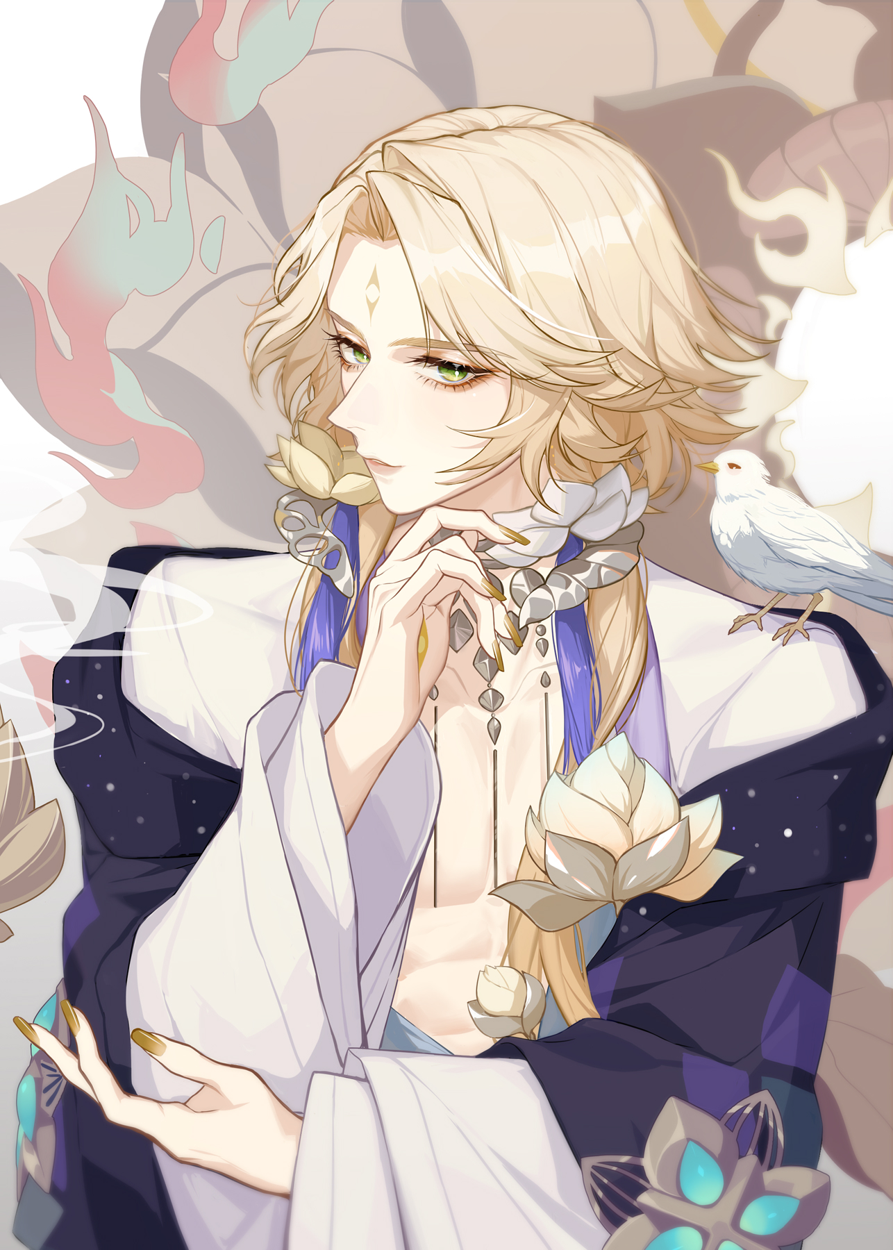 1boy bare_pectorals bishounen blonde_hair djlamb-ao earrings flower green_eyes highres japanese_clothes jewelry lotus male_focus onmyoji pectorals short_hair solo taishakuten_(onmyoji)