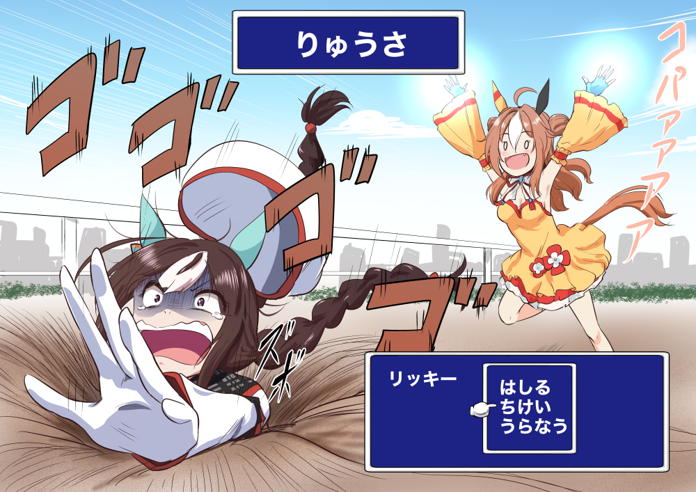 0_0 2girls ahoge animal_ears armpits arms_up bare_shoulders beret blue_gloves bow bowtie braid breasts brown_hair cheating_(competitive) cleavage commentary_request copano_rickey_(umamusume) detached_sleeves dress ear_covers fang final_fantasy final_fantasy_v fingerless_gloves gameplay_mechanics gem gloves glowing_hands hair_between_eyes hair_ribbon hat hokko_tarumae_(umamusume) horse_ears horse_girl horse_racing_track horse_tail hoxutixu jewelry layered_dress long_hair multicolored_hair multiple_girls orange_dress ribbon running shaded_face sleeveless sleeveless_dress strapless strapless_dress tail tearing_up tress_ribbon twin_braids two-tone_hair umamusume white_bow white_bowtie white_gloves white_hair white_headwear wide_sleeves