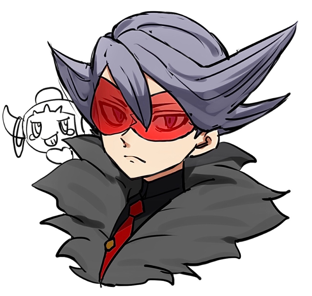 1boy black_shirt closed_mouth commentary_request echizen_(n_fns17) frown gen_6_pokemon highres hoopa hoopa_(confined) lear_(pokemon) legendary_pokemon looking_at_viewer male_focus mythical_pokemon necktie nintendo pokemon pokemon_masters_ex portrait red-tinted_eyewear red_necktie shirt spiked_hair sunglasses tinted_eyewear white_background