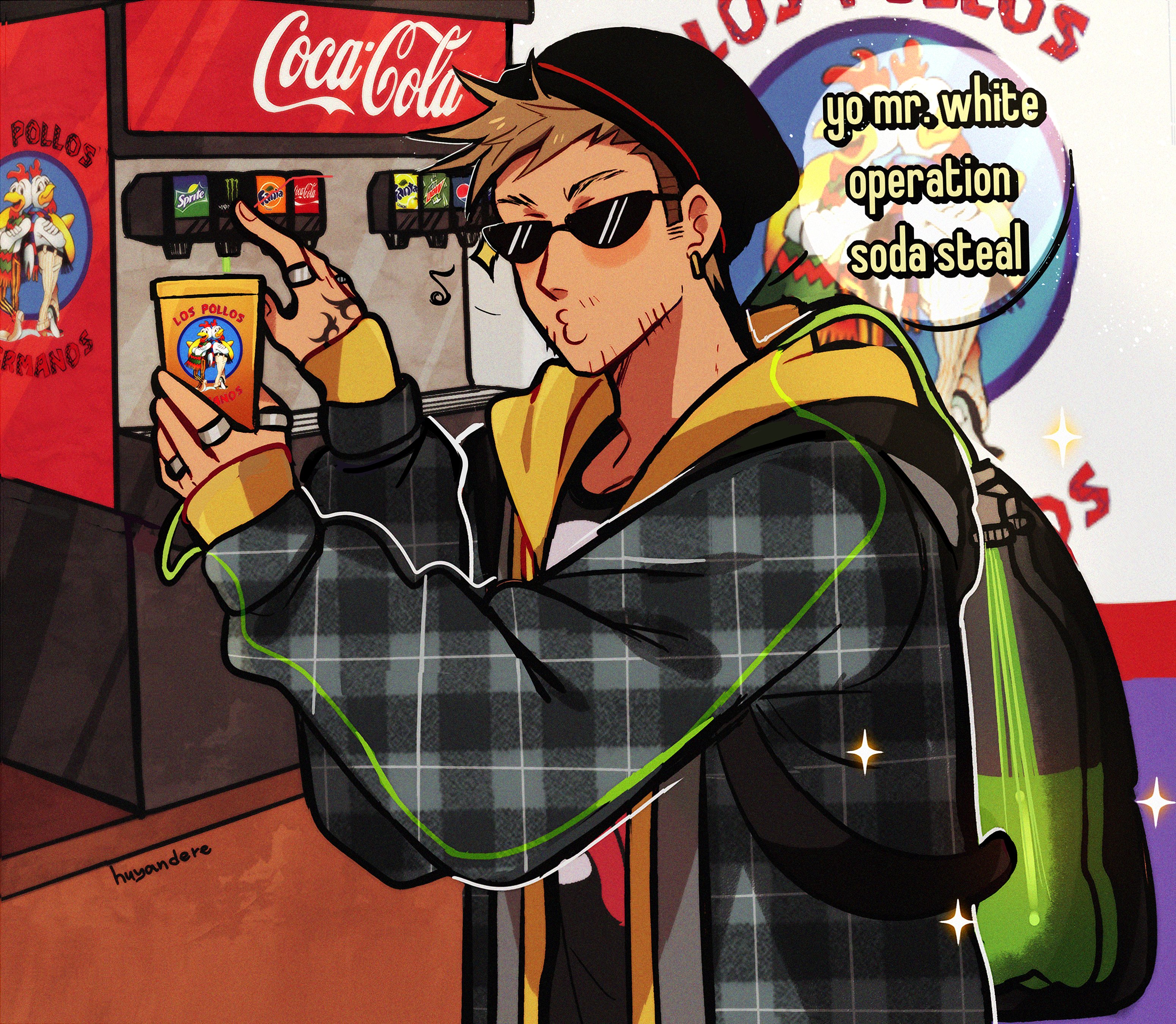 1boy absurdres animification beanie black_hat breaking_bad brown_hair commentary cup ear_piercing english_commentary english_text facial_hair hat highres holding holding_cup hood hood_down huyandere jacket jesse_pinkman jewelry long_sleeves los_pollos_hermanos male_focus meme multiple_rings musical_note o3o open_clothes open_jacket operation_soda_steal_(meme) piercing ring signature soda_fountain solo sparkle stubble sunglasses