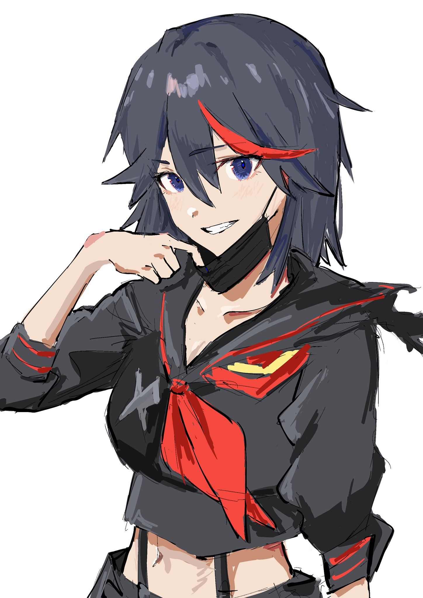1girl black_hair blue_eyes collarbone highres kill_la_kill looking_at_viewer mask matoi_ryuuko navel school_uniform senketsu serafuku simple_background smile solo tomotenasi_e upper_body white_background
