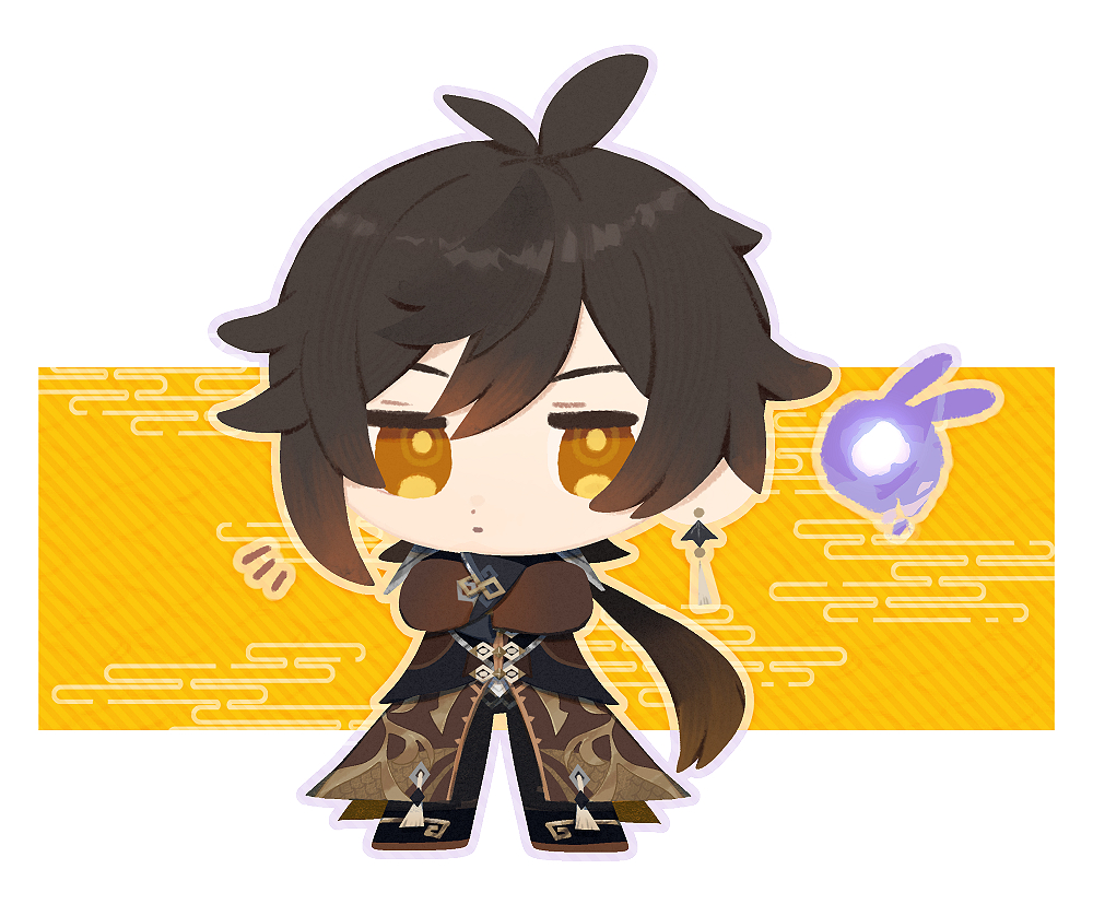 1boy black_hair black_pants black_shoes brown_eyes brown_hair brown_jacket chibi closed_mouth commentary_request crossed_arms diagonal_stripes earrings egasumi eyebrows_hidden_by_hair full_body genshin_impact gradient_hair hair_between_eyes jacket jewelry kiduta_cielo low_ponytail male_focus multicolored_hair notice_lines pants ponytail shoes solo standing striped_background two-tone_background white_background yellow_background zhongli_(genshin_impact)