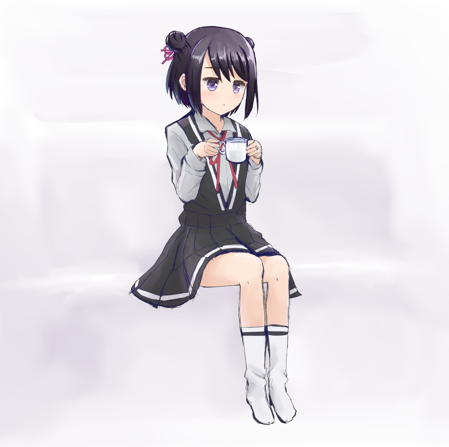 1girl black_dress black_hair blush closed_mouth cup dot_mouth dot_nose double_bun dress expressionless grey_background grey_shirt hair_bun highres holding holding_cup invisible_chair kneehighs long_sleeves looking_at_object loose_socks magia_record:_mahou_shoujo_madoka_magica_gaiden mahou_shoujo_madoka_magica mug neck_ribbon no_footwear pleated_dress purple_eyes red_ribbon ribbon school_uniform shirt shirt_under_dress short_dress short_hair side_up_bun sidelocks sitting socks solo swept_bangs usagikoya white_socks