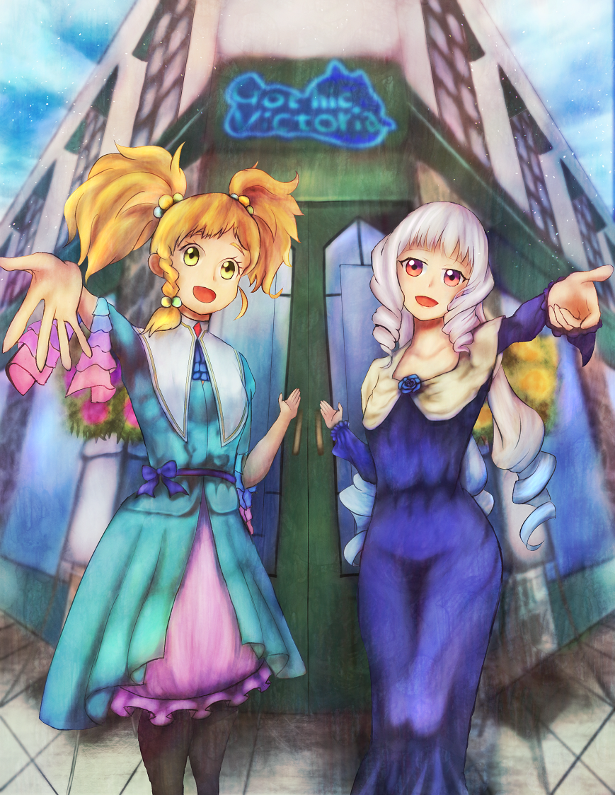 2girls aikatsu!_(series) aikatsu_stars! aqua_dress blue_dress capelet dress fujino_123 gothic_victoria gradient_hair looking_at_viewer multicolored_hair multiple_girls nikaido_yuzu reaching reaching_towards_viewer shirogane_lily shop