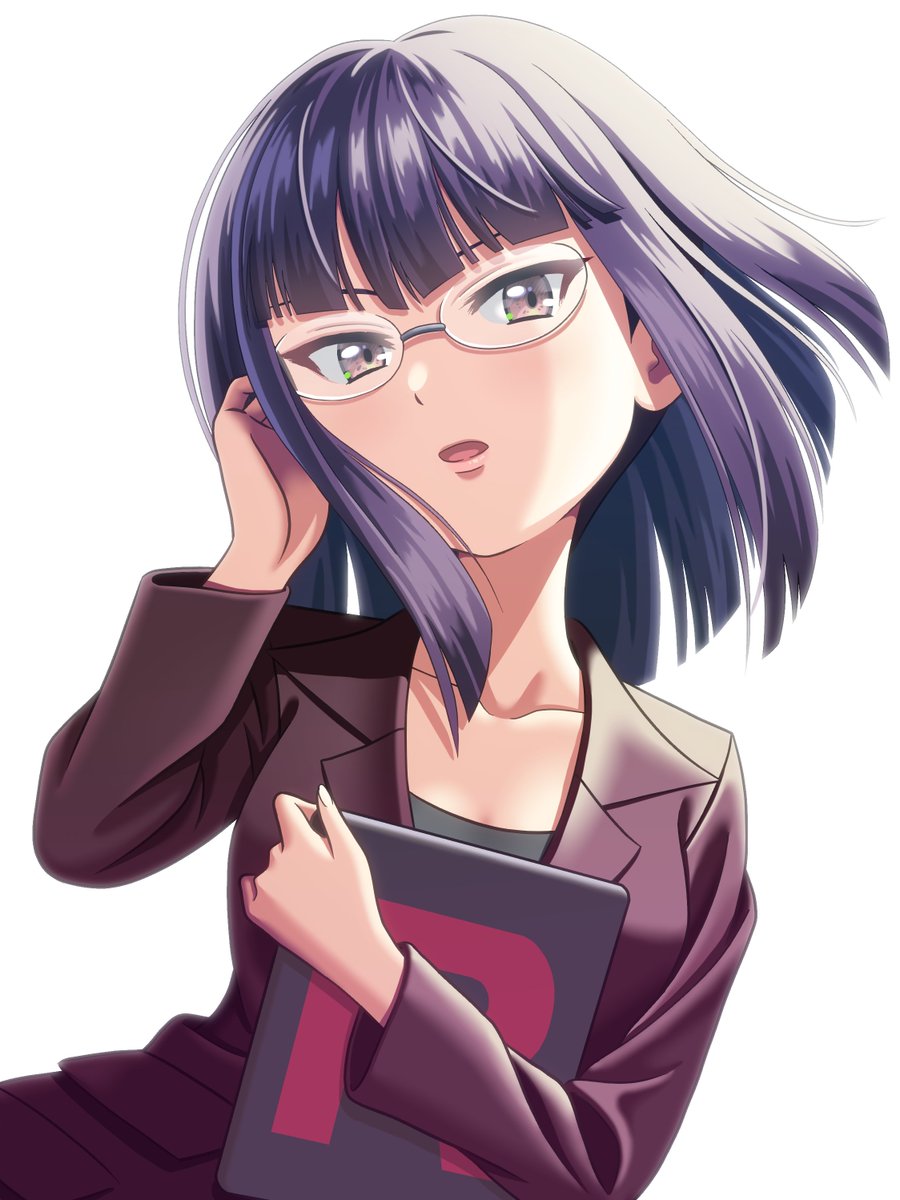 1girl brown_eyes collarbone commentary_request glasses highres holding jacket logo matori_(pokemon) medium_hair nintendo oka_mochi open_mouth pokemon pokemon_(anime) pokemon_the_series:_xy purple_hair shirt sidelocks simple_background solo team_rocket tongue white_background